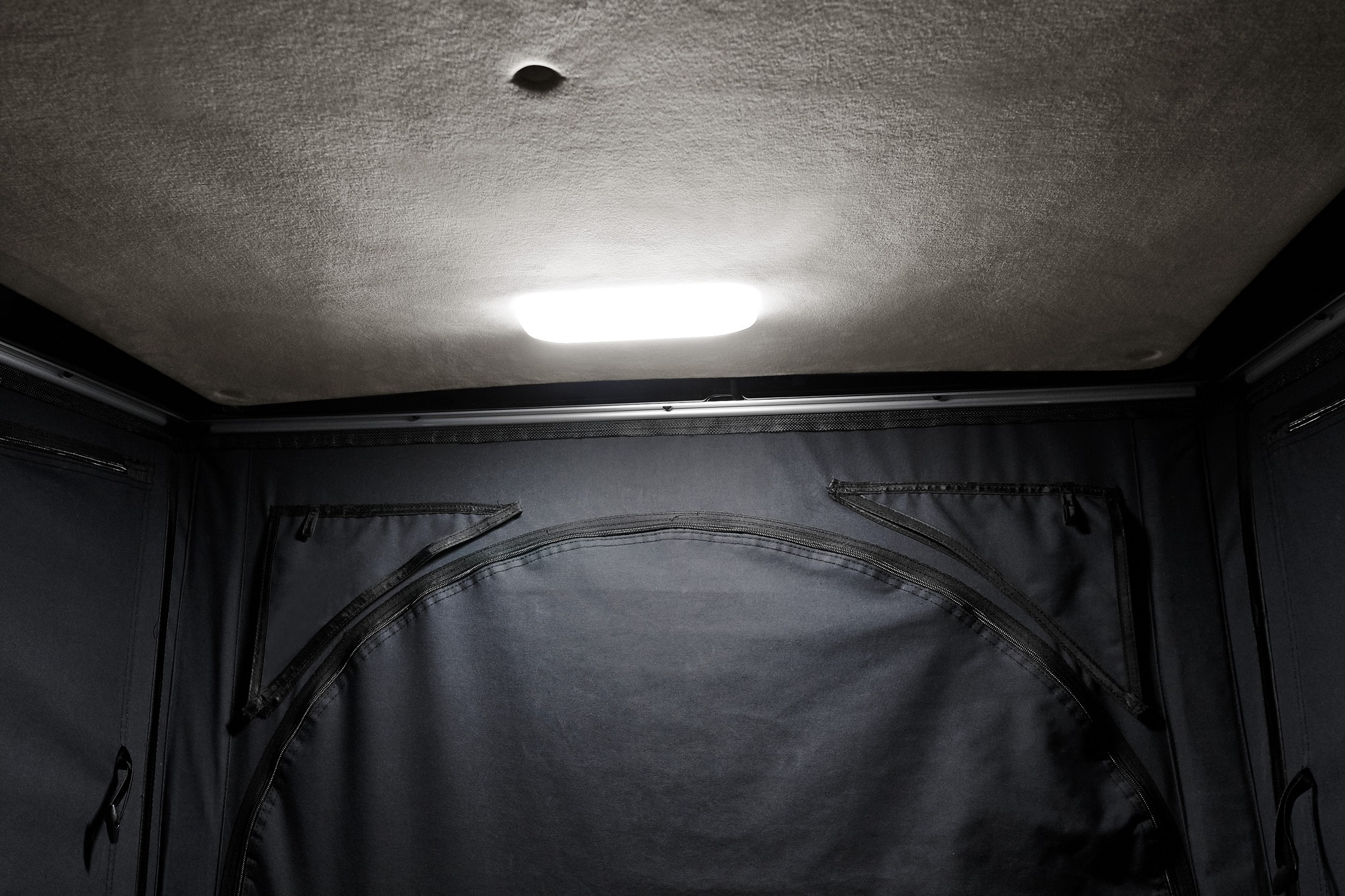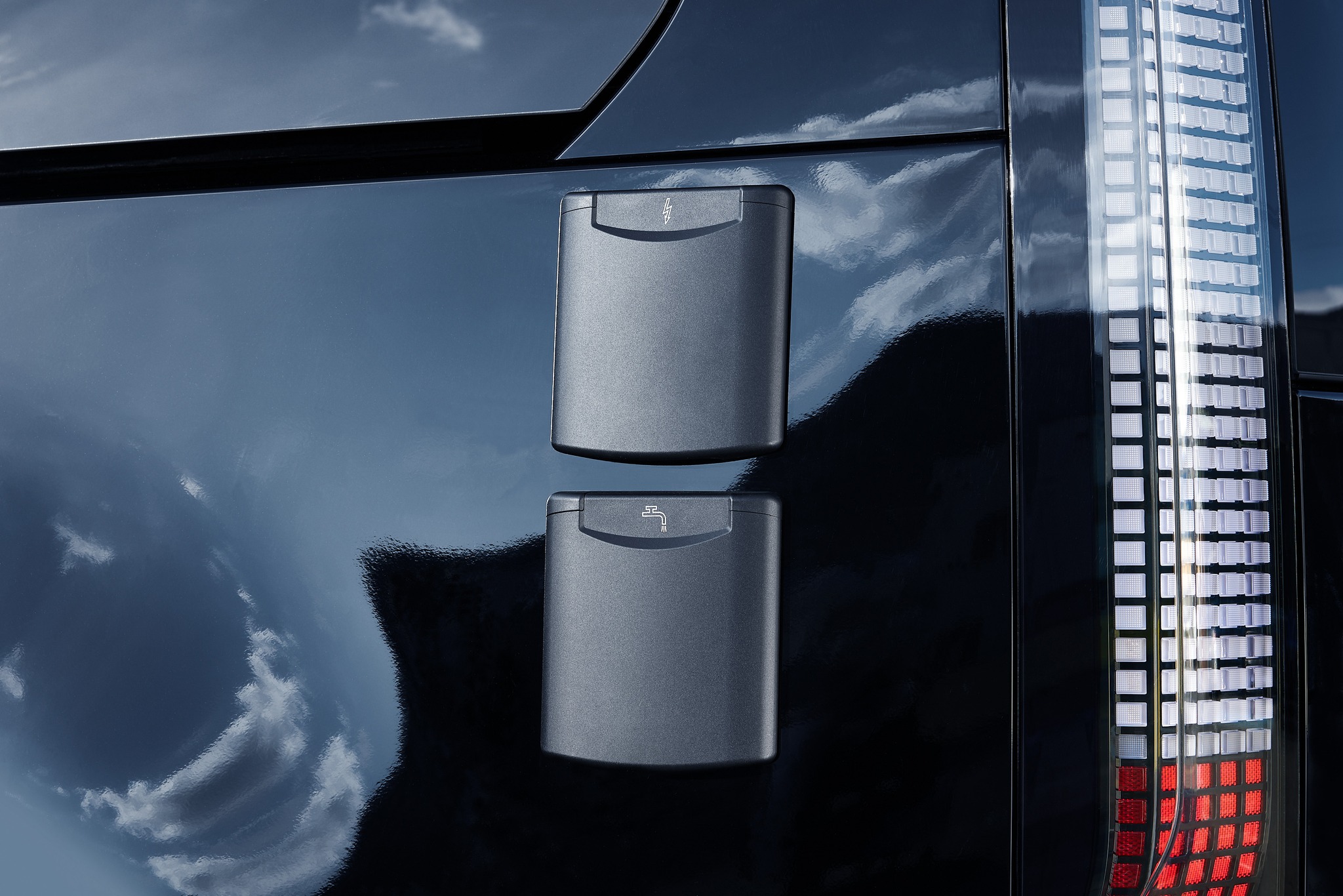 캠퍼의 전동식 팝업루프는 곡선을 통해 공기역학적인 디자인을 적용하고 차체와 동일한 소재를 사용해 일체감을 준다. 또한 루프를 위로 들어 올리면 성인 2명이 취침할 수 있는 공간으로 활용 가능하고, 실내 램프와 매트리스가 마련돼 있어 안락한 공간을 연출한다. 우측 어닝(차양막) 시스템은 공간을 확장해 사용할 수 있게 해주며 어닝 내부에 장착한 LED 조명은 야간 편의성을 높여준다.