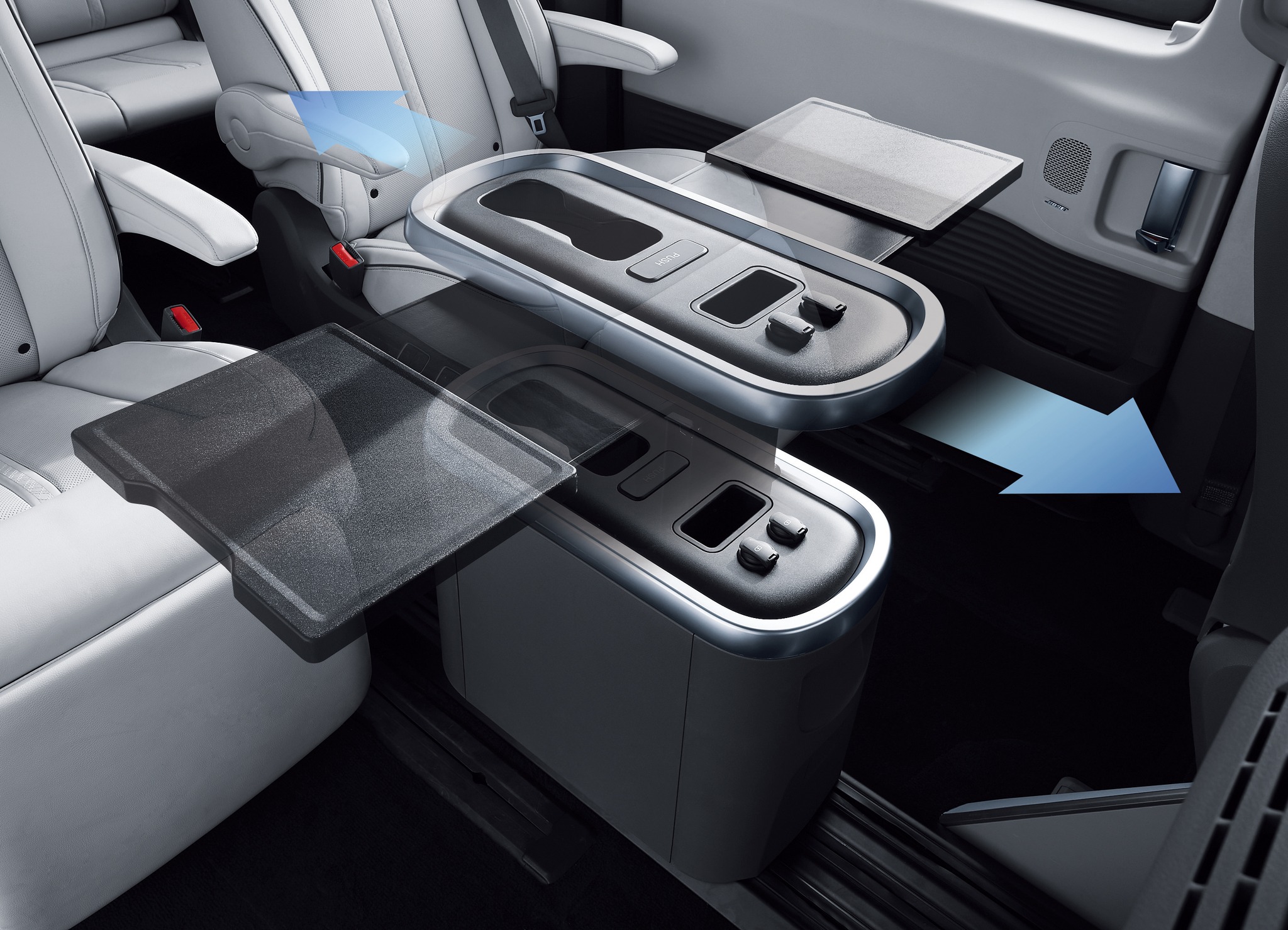 실내는 기본 트림의 전고 보다 205mm를 늘리고, 1열에서 2~3열까지 이동 가능한 무버블 콘솔을 적용해 공간 활용성을 극대화했다. 무버블 콘솔에는 ▲팝업식 테이블 ▲컵홀더 ▲USB C타입 충전 기능도 포함되어 있다.