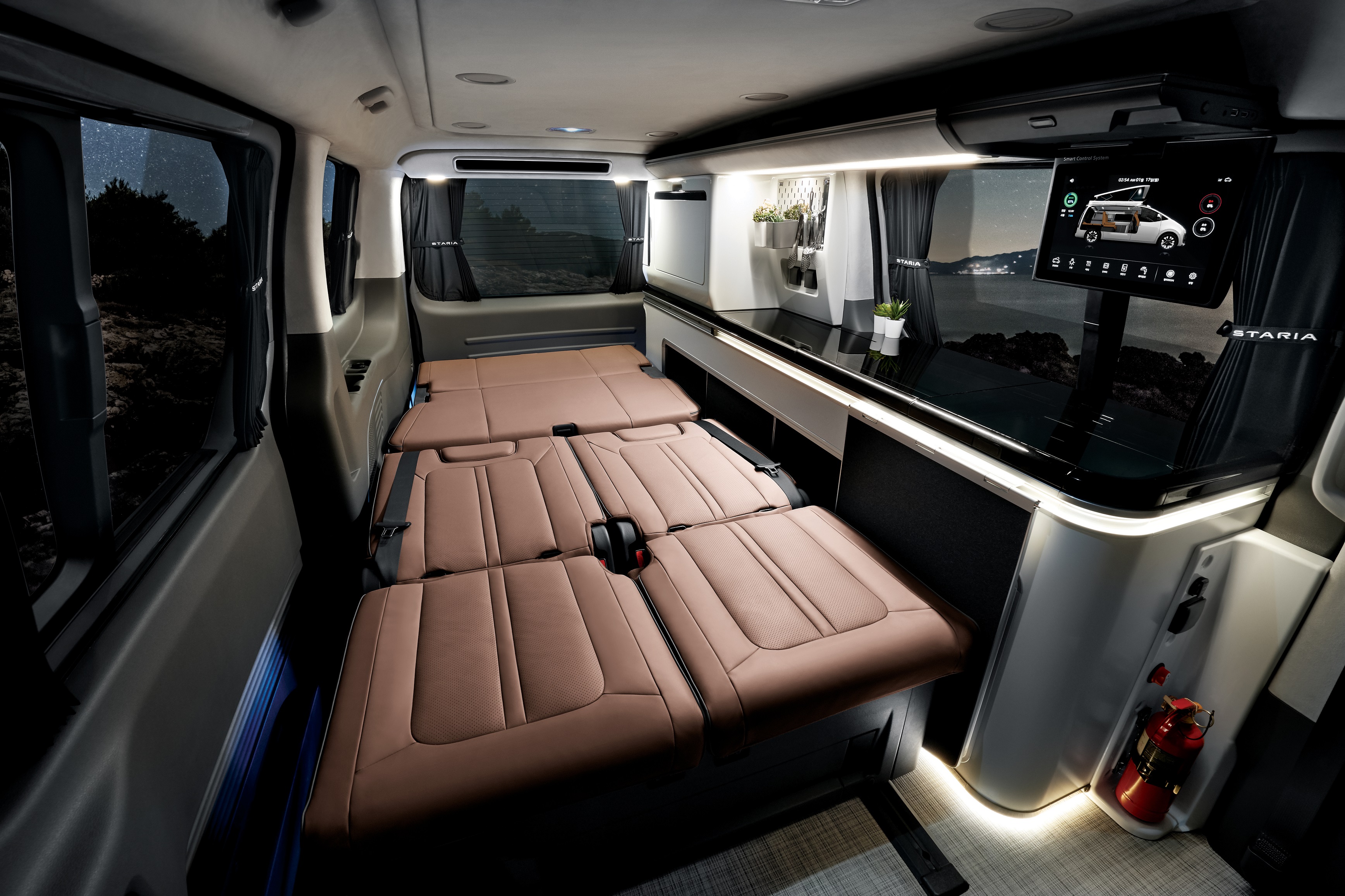 여기에 캠퍼 4는 ▲12.1인치 접이식 통합 컨트롤러 및 모니터 ▲3열 리클라이닝 벤치 ▲슬라이드 후방 테이블 ▲외부전원 장치 ▲청수통 70ℓ 및 오수통 40ℓ ▲36ℓ 빌트인 냉장고 및 싱크대 등 캠핑에 필요한 사양들을 추가로 적용해 사용성을 향상시켰다. 그리고, 스타리아 라운지 캠퍼는 경쟁차 대비 낮은 전고(2.095mm)로 2.1m이하만 출입 가능한 대다수의 지하주차장을 이용할 수 있다.
