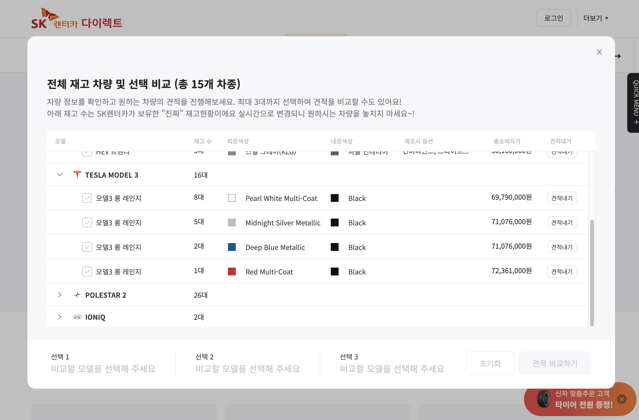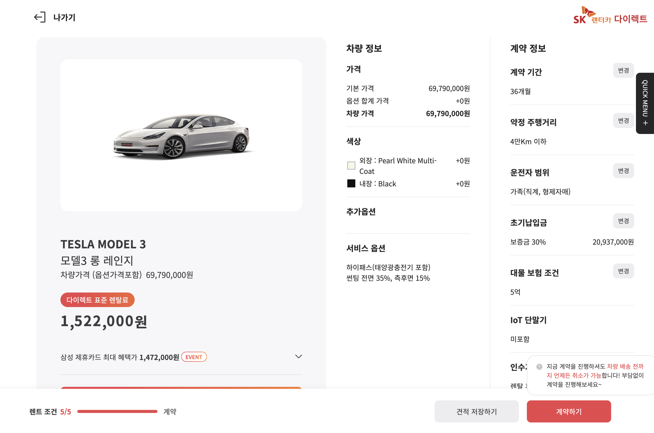 최근 인상된 가격분만 생각하더라도, SK 렌터카 다이렉트를 이용하면, 테슬라 모델3의 경우에 300~450만원정도 더 저렴하게 구입이 가능하다. 그리고, 견적을 내는 방법도 간편한데, 홈페이지를 통해 몇번의 클릭만으로 쉽게 견적을 낼 수 있다.