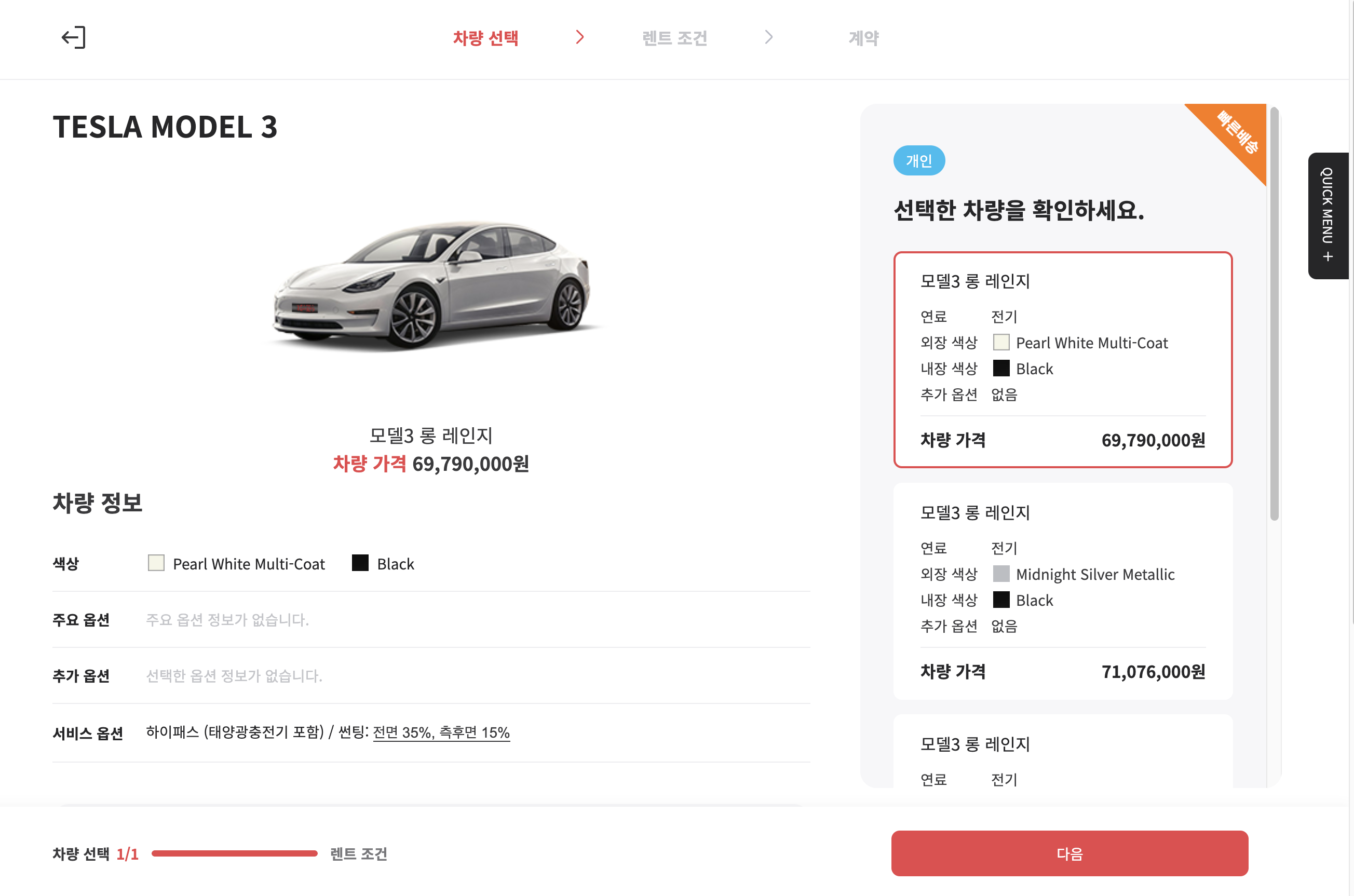 최근 인상된 가격분만 생각하더라도, SK 렌터카 다이렉트를 이용하면, 테슬라 모델3의 경우에 300~450만원정도 더 저렴하게 구입이 가능하다. 그리고, 견적을 내는 방법도 간편한데, 홈페이지를 통해 몇번의 클릭만으로 쉽게 견적을 낼 수 있다.