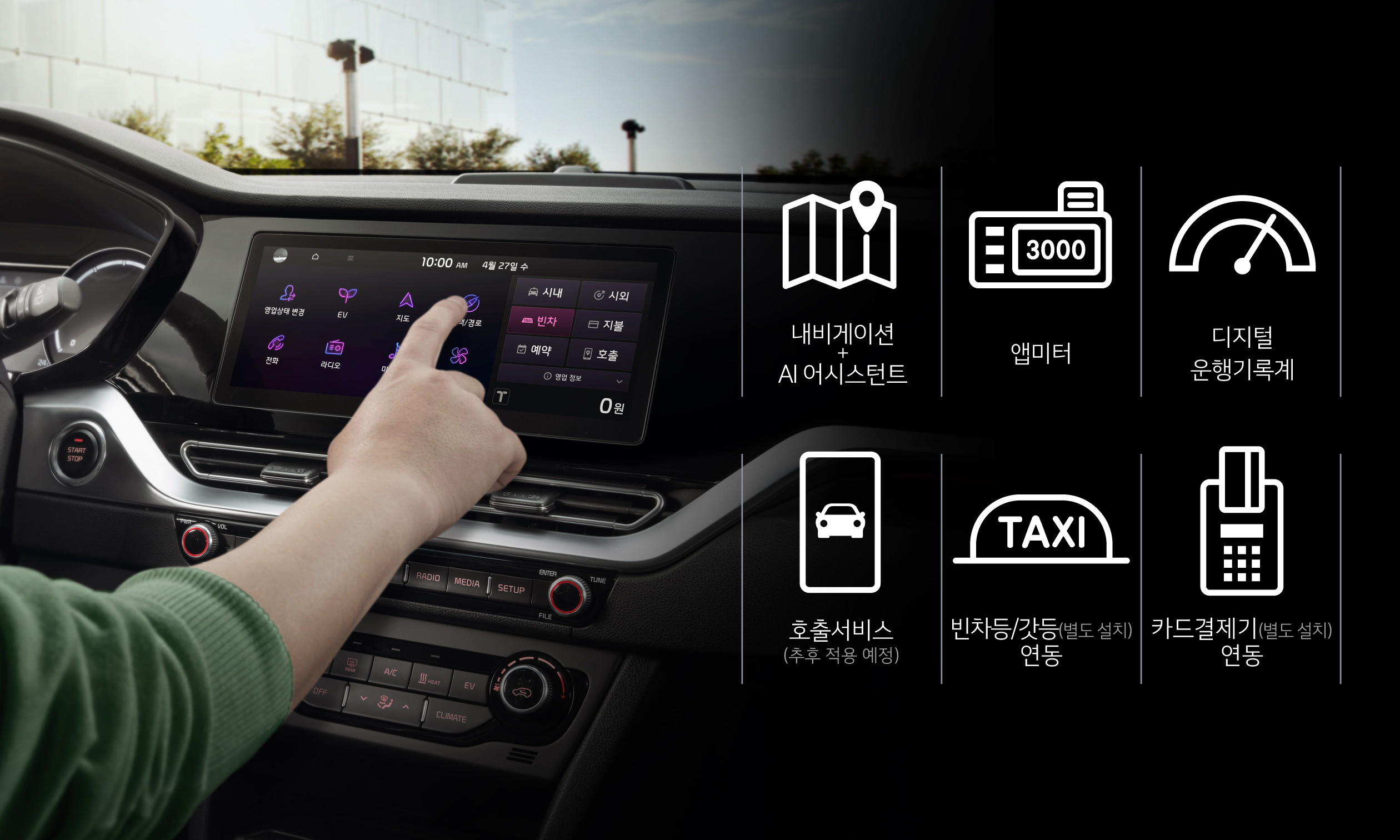 기아는 올인원 디스플레이에 내비게이션, 앱미터, 디지털운행기록계를 통합 적용했다. 이를 통해 ▲행정구역 별 위치 데이터 기반 자동 시외할증 기능으로 승객과의 분쟁 가능성을 줄이고 ▲택시 업계의 선호도가 높은 티맵 오토 내비게이션과 ▲요금개정 등 신규 택시 요금체계 적용 시 무선 업데이트(OTA)를 통해 때와 장소의 제약없이 신규 요금 체계를 적용할 수 있는 앱미터로 고객의 편의성을 높일 것으로 기대한다.