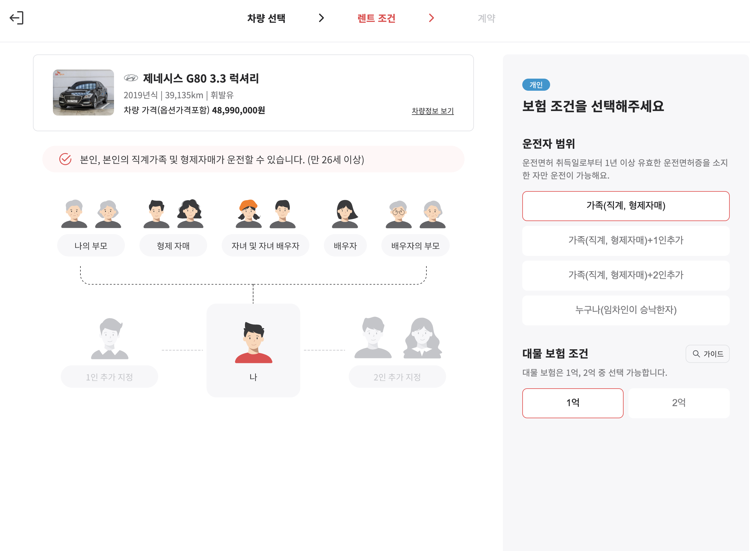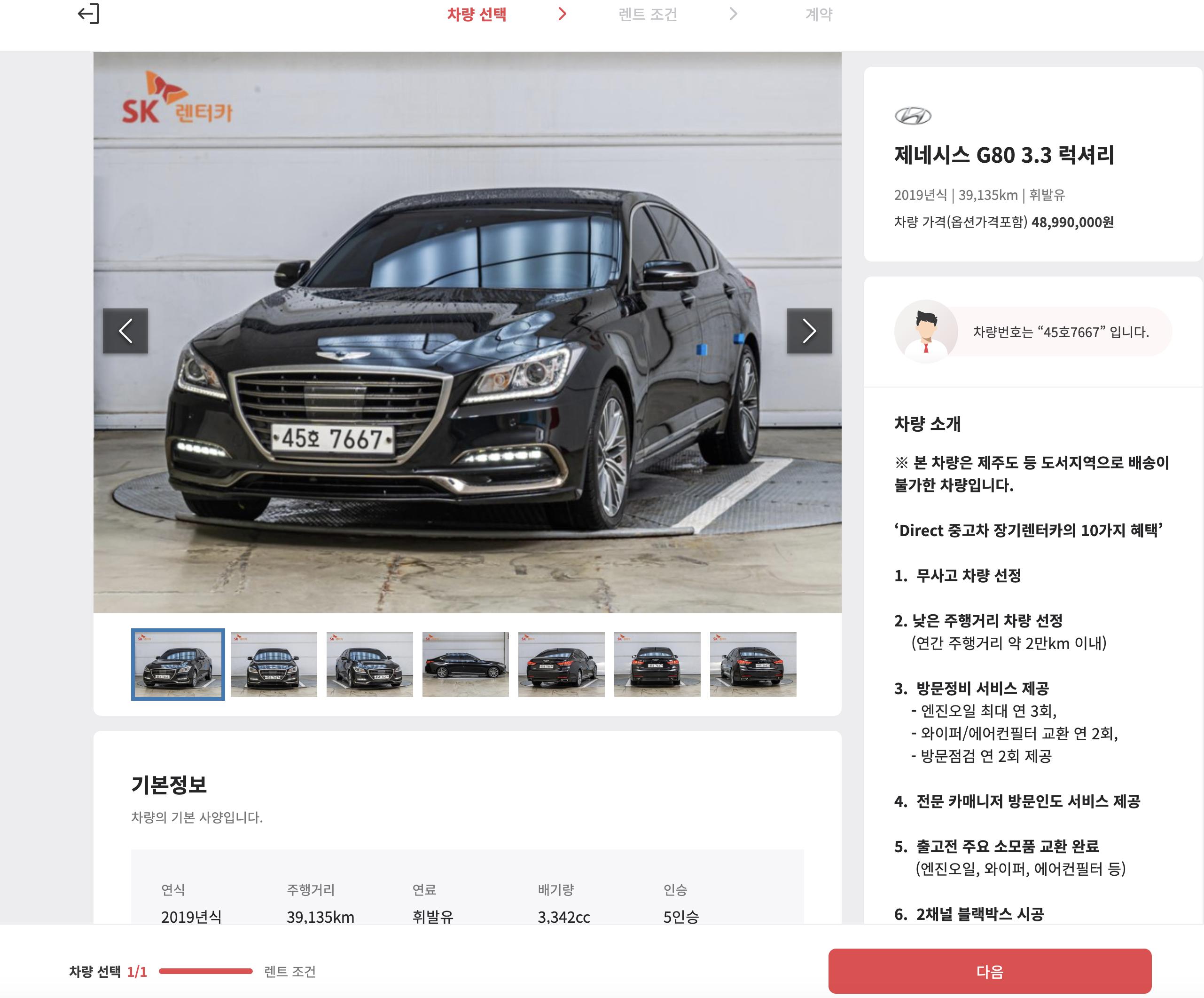 SK 렌터카 다이렉트 홈페이지에서 중고차 장기렌트 견적을 내보는 것은 어렵지 않다 홈페이지에 나와있는 제네시스 G80 3.8 을 갖고 견적을 내보면 다음과 같다. 크게 어렵지 않으며, 누구나 해볼 수 있다. 마음에 드는 차량을 선택하고, 본인확인을 거쳐서 차량의 옵션을 확인하고, 계약 조건과 약정 주행거리 및 보험조건과 초기납입금을 정하면, 최종 렌탈료가 나오게 된다. 이렇게 몇번의 클릭만으로 손쉽게 중고차 장기렌트 견적을 내볼 수 있다.