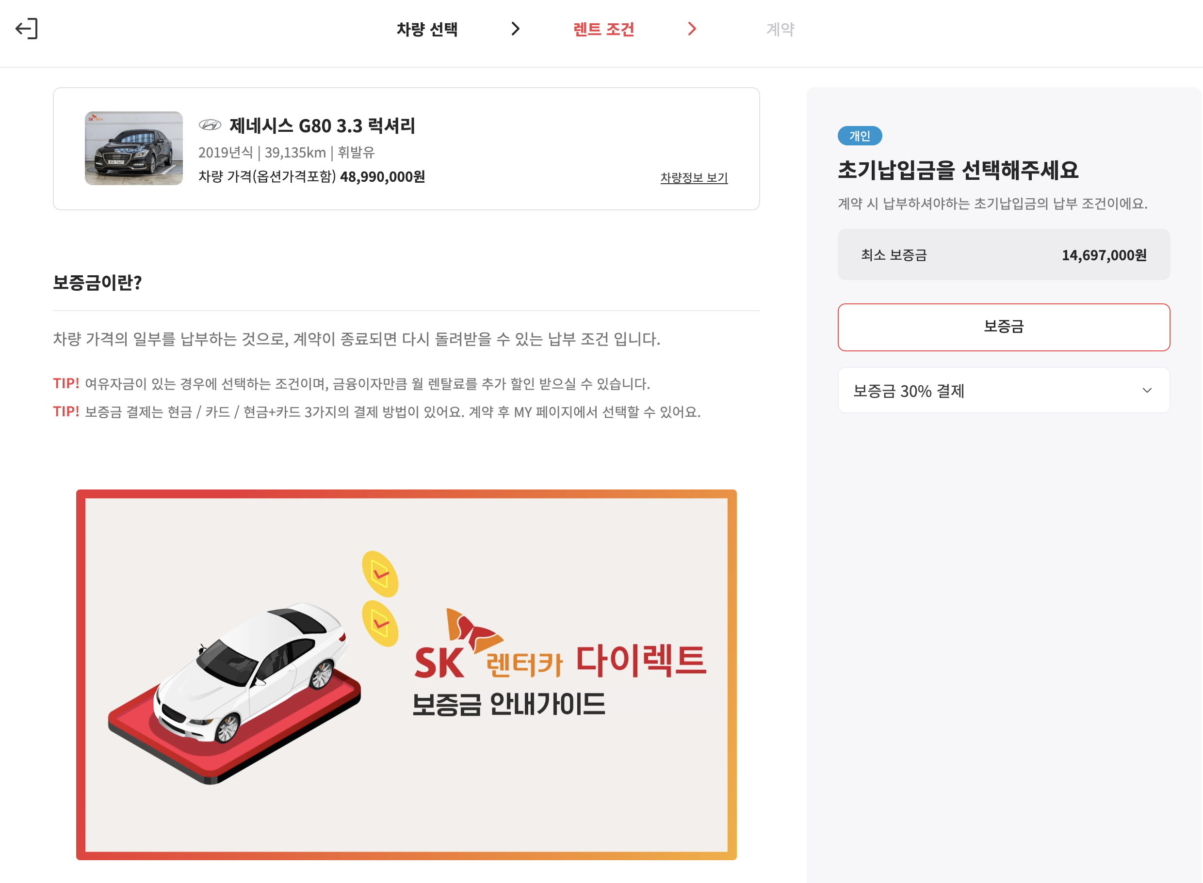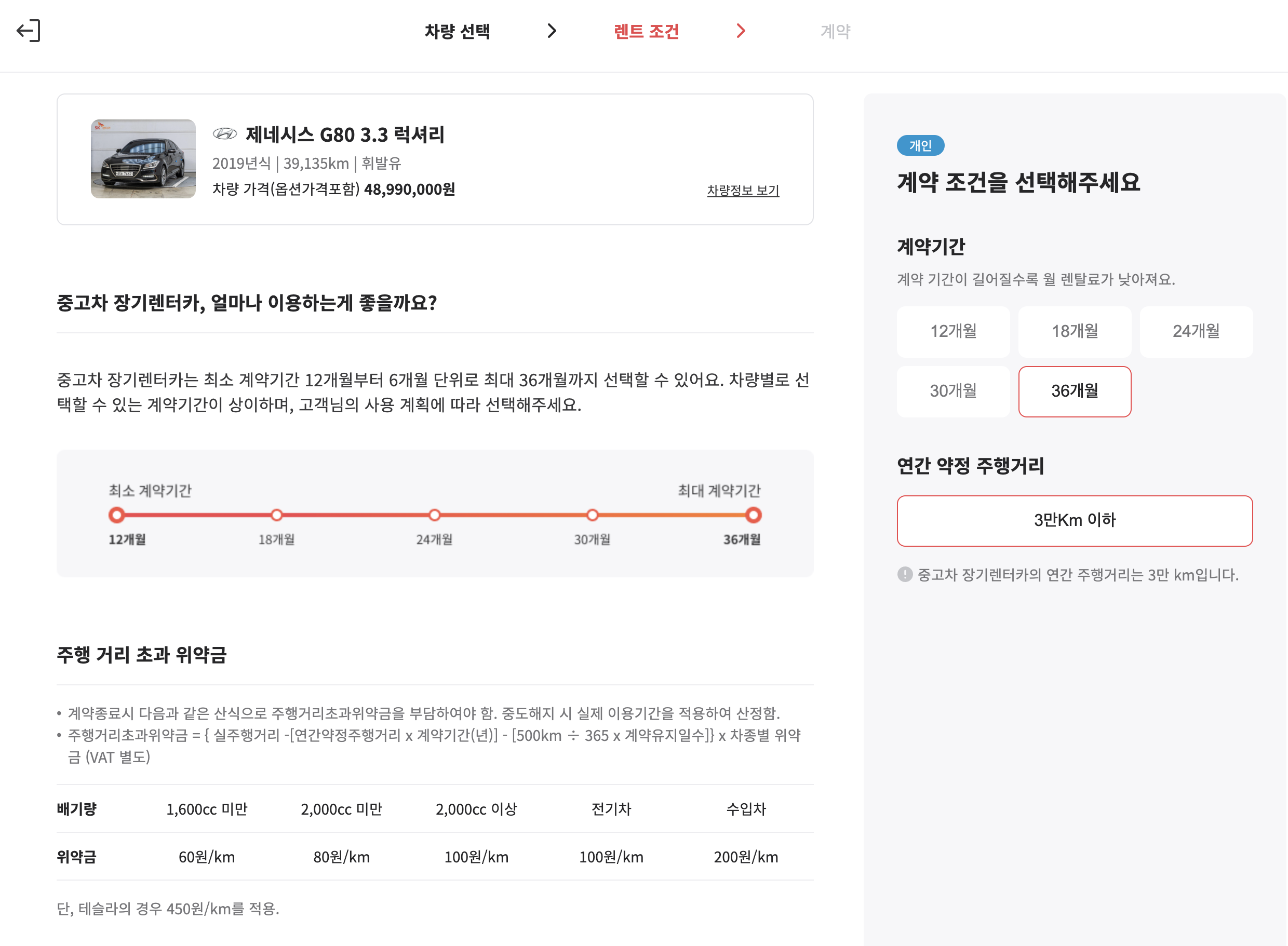 SK 렌터카 다이렉트 홈페이지에서 중고차 장기렌트 견적을 내보는 것은 어렵지 않다 홈페이지에 나와있는 제네시스 G80 3.8 을 갖고 견적을 내보면 다음과 같다. 크게 어렵지 않으며, 누구나 해볼 수 있다. 마음에 드는 차량을 선택하고, 본인확인을 거쳐서 차량의 옵션을 확인하고, 계약 조건과 약정 주행거리 및 보험조건과 초기납입금을 정하면, 최종 렌탈료가 나오게 된다. 이렇게 몇번의 클릭만으로 손쉽게 중고차 장기렌트 견적을 내볼 수 있다.