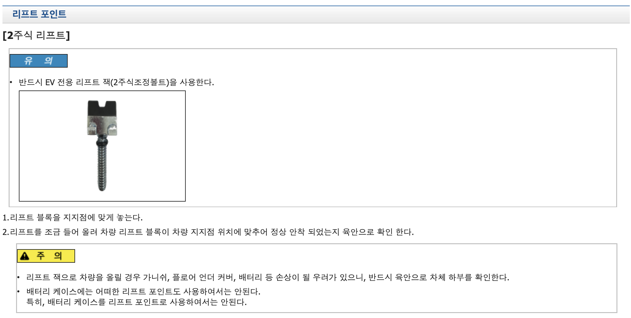 현대기아 자동차의 경우에는 반드시 EV 전용 리프트잭을 사용해 정해진 지지점 위치에 맞춰 리프트에 띄워야 한다고 규정하고 있다. 또한, 주의사항으로 리프트 잭으로 차량을 올릴 경우에 가니쉬, 플로어 언더커버, 배터리 등이 손상될 우려가 있으니, 육안으로 하부를 확인해야 하며, 배터리 케이스를 리프트 포인트로 사용해서는 안된다고 밝히고 있다.