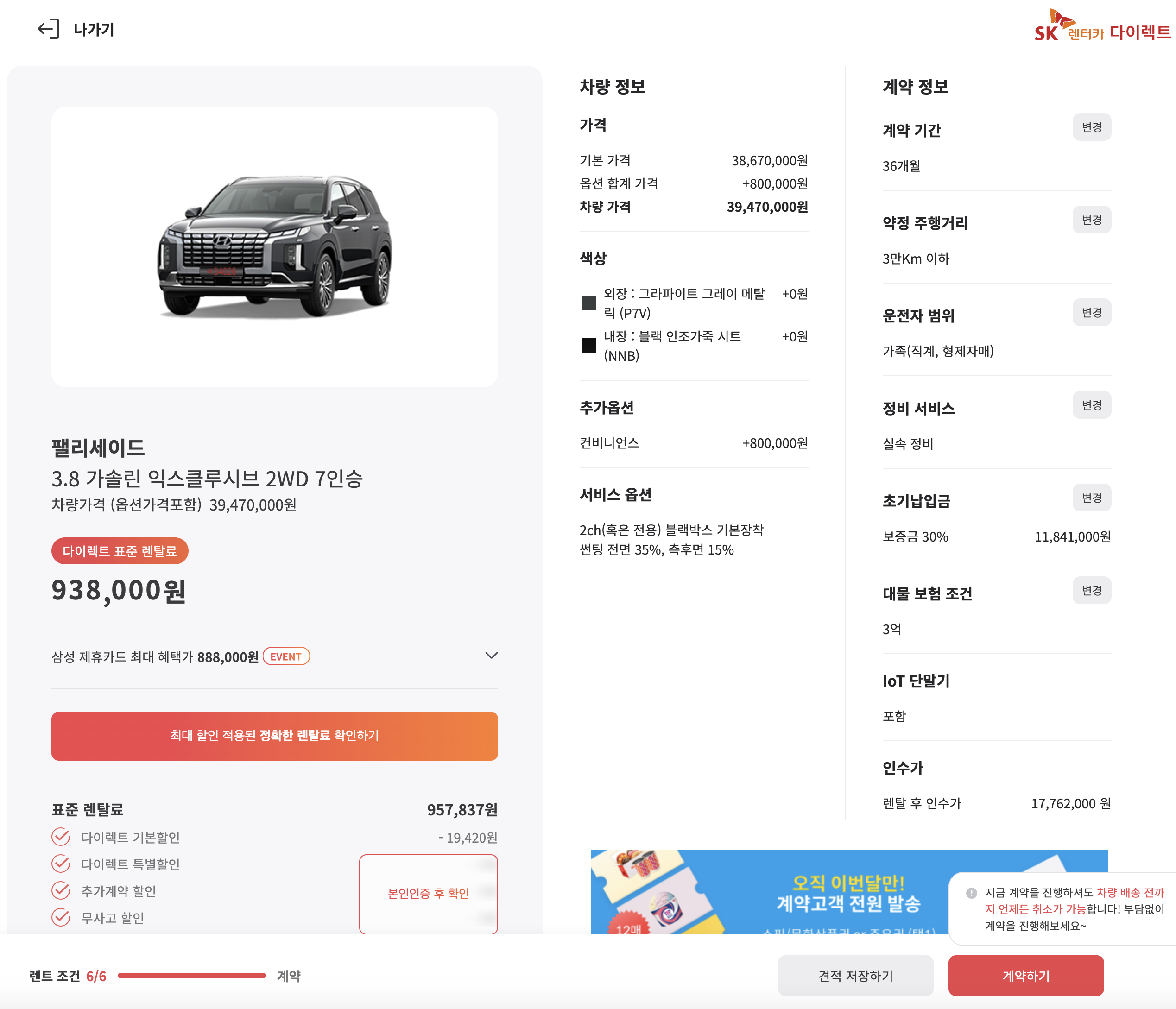 본인이 원하는 장소 혹은 송도 신차인수센터에서 직접 방문하여 바로 출고도 가능한데, 100% 온라인 비대면으로 전자계약으로 진행되며, 지금 SK렌터카 다이렉트 1주년 프로모션으로 6월중으로 계약하게 된다면, 대물보험 1억에서 3억으로 무료 업그레이드를 지원해주며, 실속정비 50% 할인과 전 차종 월렌탈료 할인을 지원해준다.