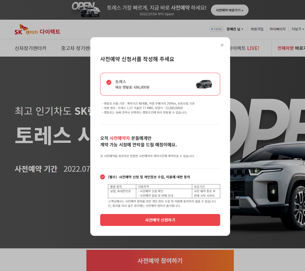 SK렌터카 다이렉트에서는 렌터카 업체 중 유일하게, 단독으로 쌍용자동차 신차를 확보하고, 빠른 출고가 가능하다. 업계 유일하게 쌍용차 토레스 신차장기렌트카 상품을 확보했는데, 구입 희망고객을 위해 SK렌터카 다이렉트에서 사전예약을 7월 4일부터 7월 8일까지 진행하고 있다.