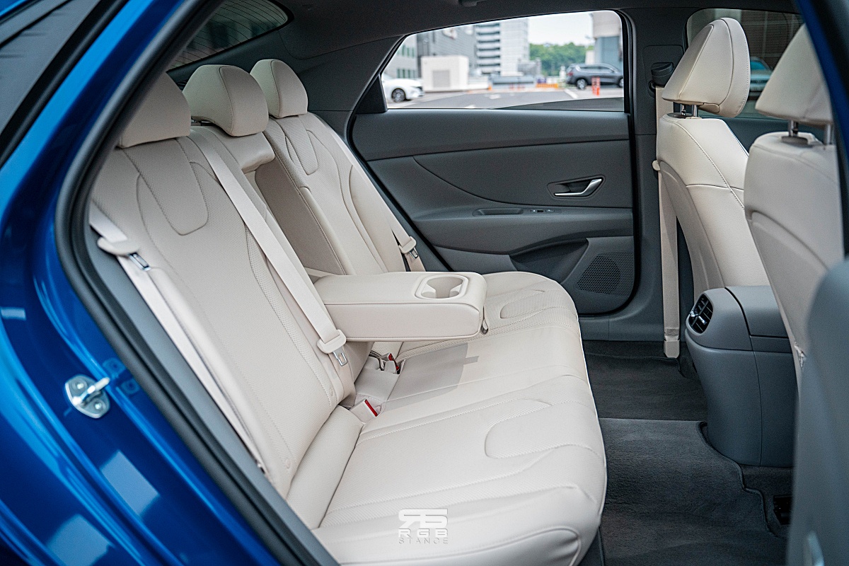 이렇게 실내외의 디자인적 차이는 크게 없다. 운전자 중심의 레이아웃이 파노라마 디스플레이와 함께 심플하면서도 하이테크한 느낌과 고급감을 보여주고, 2022 아반떼에서는 선택사양인 10.25인치 내비게이션과 함께 앞좌석 통풍시트가 기본 적용되어 있다. 여기에 동승석 전동시트, 진동 경고 스티어링 휠 등 고객 만족도가 높은 편의사양이 기본으로 들어가 있어서 상품성이 좋다. 그리고, 엠비언트 라이트까지 실내의 감성을 끌어올려준다. 2열 공간도 여전히 넓다. 정말 이 급에서 이만한 차는 아반떼 밖에 없단 생각이 든다.