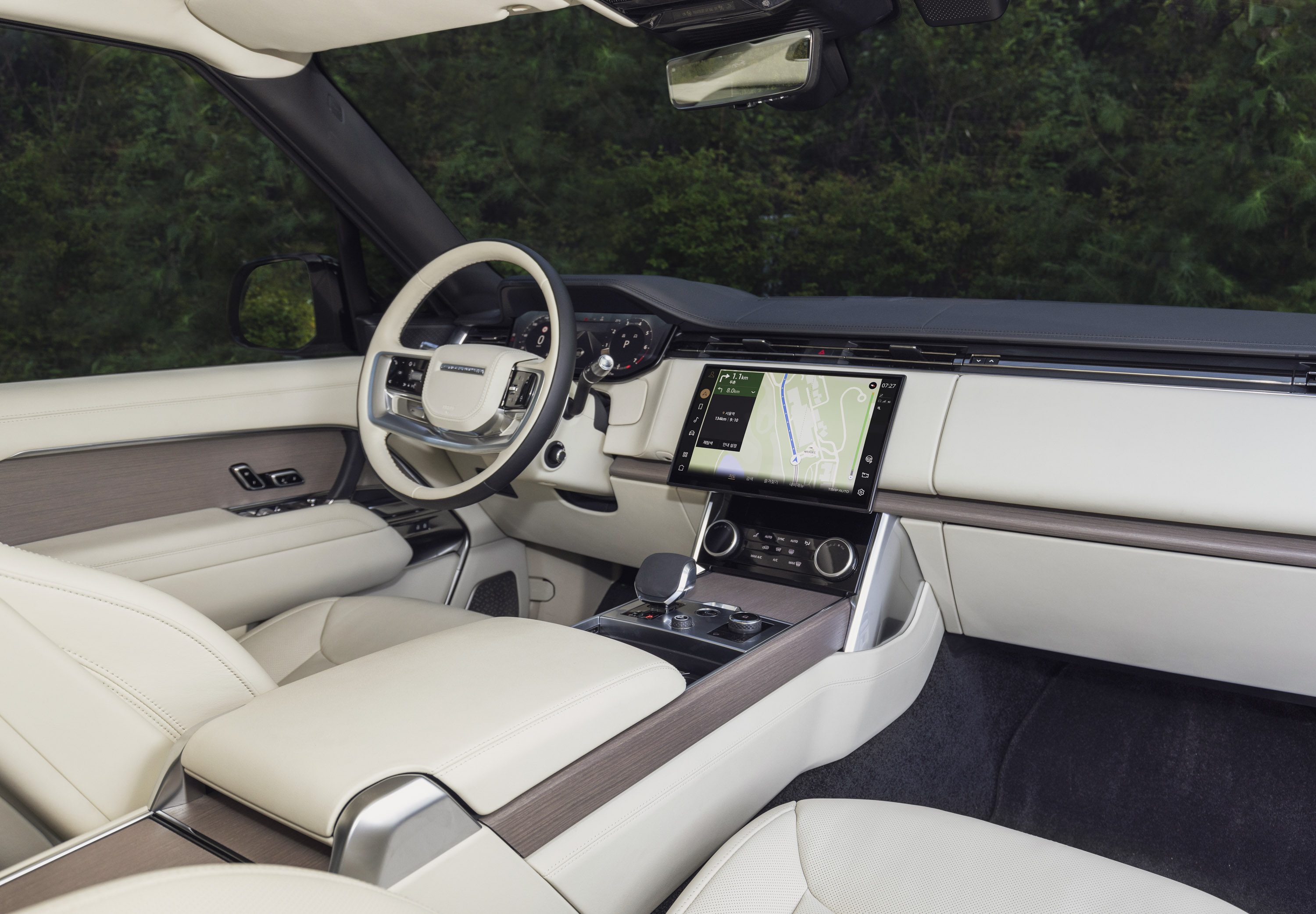 대시보드 중앙에 적용된 역대 랜드로버 모델 중 가장 큰 13.1인치 커브드 플로팅 터치스크린은 미니멀한 프레임 디자인으로 인테리어의 조형적 가벼움을 구현했다. 센터패시아의 주요 제어 장치는 명확한 층의 구조를 가지고 있어 배치가 직관적이고 정교하다. 스티어링 휠에도 인테리어 테마를 반영한 강한 수평 디자인을 적용해 안정감을 준다. 센터 콘솔의 결이 살아있는 고급스러운 우드 피니셔에는 메탈 소재를 아주 얇게 상감한 마이크로 메탈 인레이가 최초로 도입되어 기술적 정교함을 보여준다.
