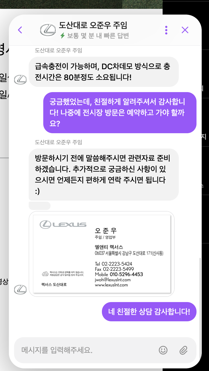 전시장에 직접 방문하거나 전화를 할 필요가 없기 때문에 익숙하면서도 부담 없이 빠른 상담이 가능한데, 이번에 ‘렉서스 도산대로’ 전시장을 선택해 궁금했던 렉서스 UX300e 전기차에 대한 상담을 요청해봤다. 역시나 부담 없이 친절한 상담이 가능했으며, 궁금한 사항들에 대한 궁금증도 해소되었다.