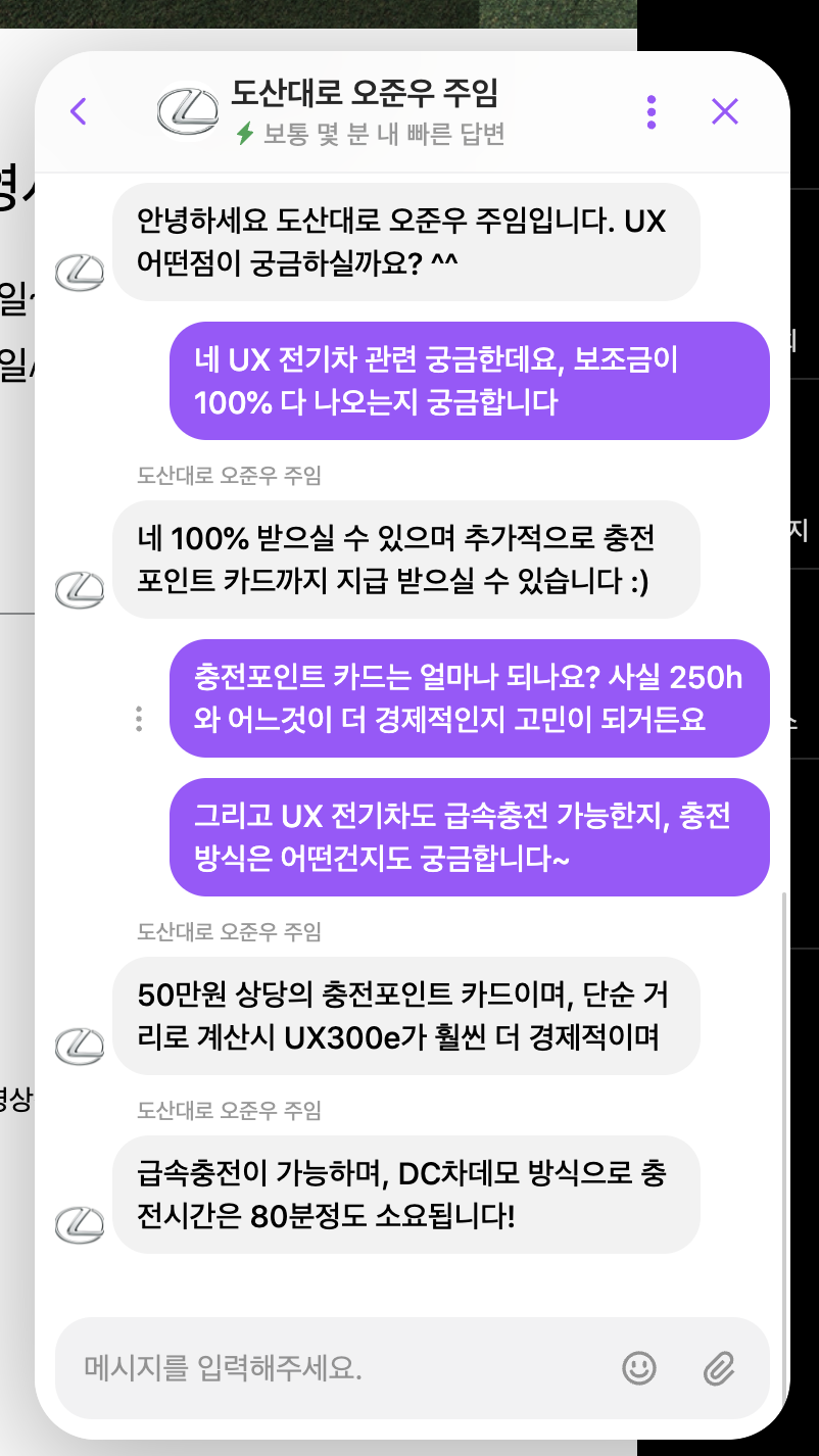 전시장에 직접 방문하거나 전화를 할 필요가 없기 때문에 익숙하면서도 부담 없이 빠른 상담이 가능한데, 이번에 ‘렉서스 도산대로’ 전시장을 선택해 궁금했던 렉서스 UX300e 전기차에 대한 상담을 요청해봤다. 역시나 부담 없이 친절한 상담이 가능했으며, 궁금한 사항들에 대한 궁금증도 해소되었다.