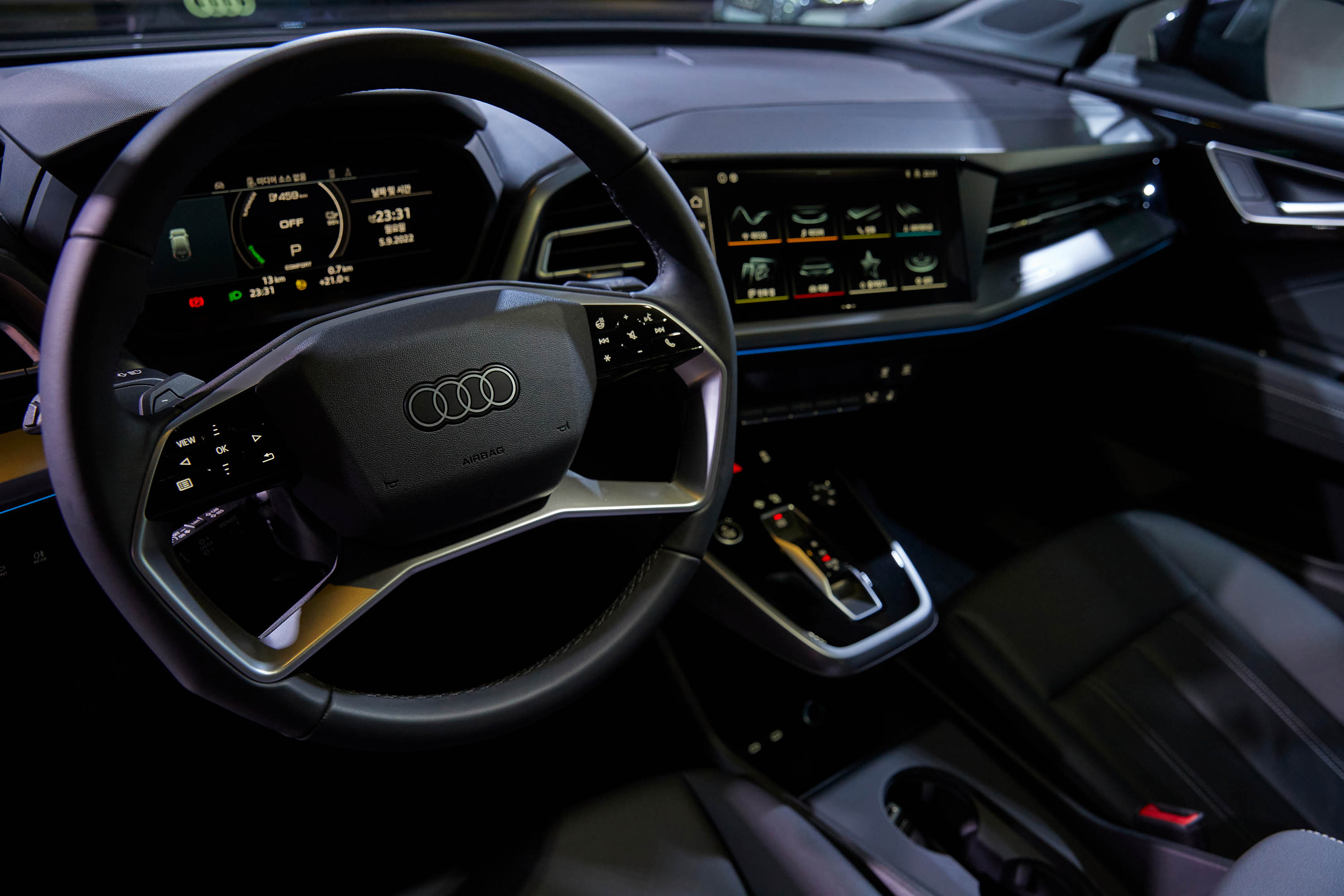 ‘아우디 Q4 e-트론’과 ‘아우디 Q4 스포트백 e-트론’의 실내는 풀사이즈 SUV에 맞먹는 넓은 실내 공간과 더불어 간결한 동력 구조 덕분에 센터 터널이 없어 앞 좌석 뿐 아니라 뒷좌석에도 넉넉한 레그룸과 수납공간을 제공하며 넓고 탁 트인 느낌을 전달한다. 시프트 패들이 포함된 더블 스포크 스포츠 스티어링 휠, 뒷좌석 폴딩 시트, 엠비언트 라이트, 앞좌석 도어 엔트리 라이트가 아우디만의 고품격 감성을 연출한다. 또한, ‘아우디 Q4 스포트백 e-트론’은 S 로고 가죽 스포츠 시트, 블랙 헤드라이닝, 스테인리스 스틸 페달, 매트 브러시 다크 알루미늄 인레이, S 로고 발광 도어 실 플레이트가 기본으로 적용되어 스포티한 매력을 한층 더 강조했다.