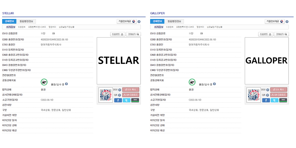 지난 2011년 11월에 그랜저의 35주년을 기념한다면서 그랜저를 재해석한 '헤리티지 그랜저' 를 공개한 바 있다. 뉴트로 컨셉트로 플래그십 세단의 럭셔리함을 극대화하고, 미래적인 파라메트릭 그릴과 함께 초대 그랜저를 기억하고 있을 중장년층에게 익숙한 그랜저로 '레트로 퓨려리즘(Retro Futurism)' 의 매력을 전달했었는데, 단순히 컨셉트카에서 멈추지 않고, 갤로퍼와 스텔라 역시 전기차로 부활시킬 예정인 듯 보인다. 현대자동차가 지난 8월에 신규 상표권을 등록했는데, 벨로스터, 코나, 캐스퍼에 이어서 그랜저와 스텔라, 갤로퍼 등을 포함하고, 모두 영문명으로 출원한 것이 확인되었다. 이는 단순한 컨셉트카가 아닌, 양산차로 나올 수 있음을 기대할 수 있는 부분이기도 하다.