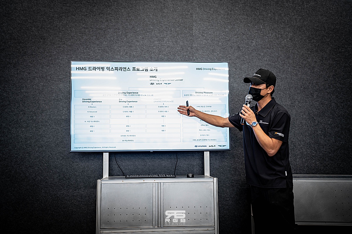 본격적으로 HMG 익스피리언스 센터에서 다채로운 주행경험을 위해 먼저 안전교육과 함께 코스 관련 교육을 먼저 받게 된다. 주행체험 코스는 총 8개의 코스가 있는데, 가혹한 조건의 주행을 할 수 있는 마른 노면 서킷과 반대로 미끄러울 수 있는 젖은 노면 서킷. 여기에 돌발상황에 대처할 수 있는 능력을 키워줄 수 있는 짐카나(gymkhana) 및 복합 슬라럼(slalom)의 가감속을 통한 다목적 주행코스 및 브레이킹 성능을 알 수 있는 제동 코스. 여기에 킥 플레이트(kick plate) 코스 및 드리프트를 체험할 수 있는 젖은 원선회 코스와 SUV 차량을 위한 경사로와 자갈 및 수로, 범피 등의 오프로드 코스로 구성되어 있다.