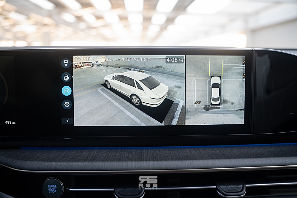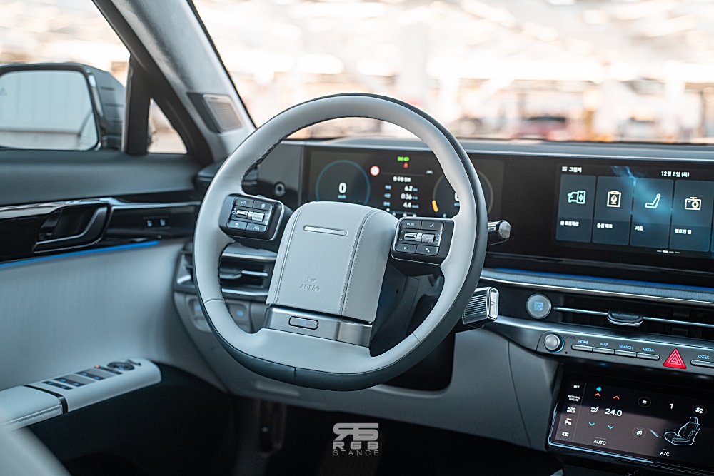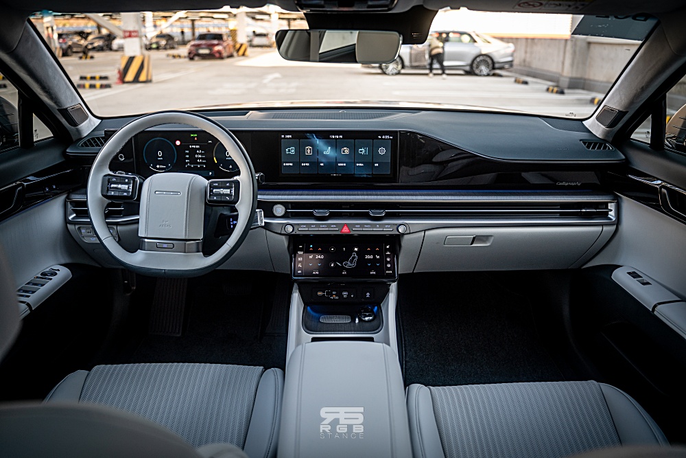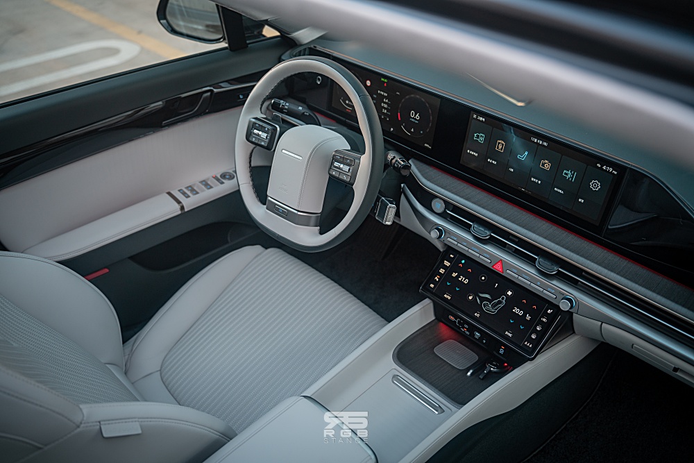 이제 플러시 타입 도어손잡이를 통해 문을 열고 실내로 들어오면 앞서 언급한 스티어링 휠이 과거를 떠올리게 만드는데, 바로 이어서 12.3인치 클러스터와 내비게이션이 일체형으로 넓은 개방감을 보여주며, 10.25인치 풀터치 공조 콘트롤러 역시 하이테크한 이미지를 보여주고 있다. 또한, 크래시패드 가니쉬에는 앰비언트 무드램프가 적용되어 있어 다채로운 주행경험을 보여준다. 전체적으로 6세대 그랜저의 라인을 다듬어 훨씬 고급스러운 실내 분위기를 만들어 냈는데, 전체적으로 탑승객을 감싸는 랩 어라운드(Wrap around) 구조로 아늑하고 고급스러운 실내 분위기를 만들어준다.