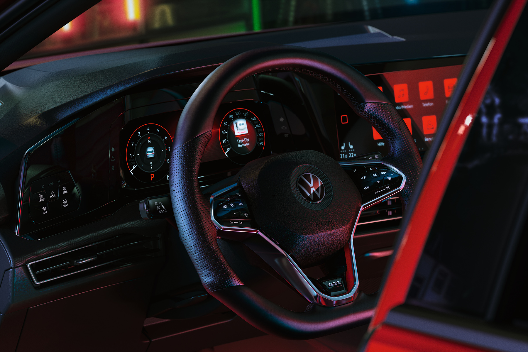 신형 골프 GTI의 인테리어는 GTI만의 스포티한 감성을 자아내면서 한층 디지털화된 사용자 경험을 선사한다. 토네이도 레드 라인 포인트가 더해진 비엔나 레더 프리미엄 스포츠 시트, 스티어링 휠에 적용된 GTI엠블럼과 블랙 메탈 크롬 데코레이티브 트림, 그리고 심장이 뛰는 듯 붉은 색이 점멸하는 엔진 스타트 버튼은 GTI만의 스포티한 매력을 발산한다.