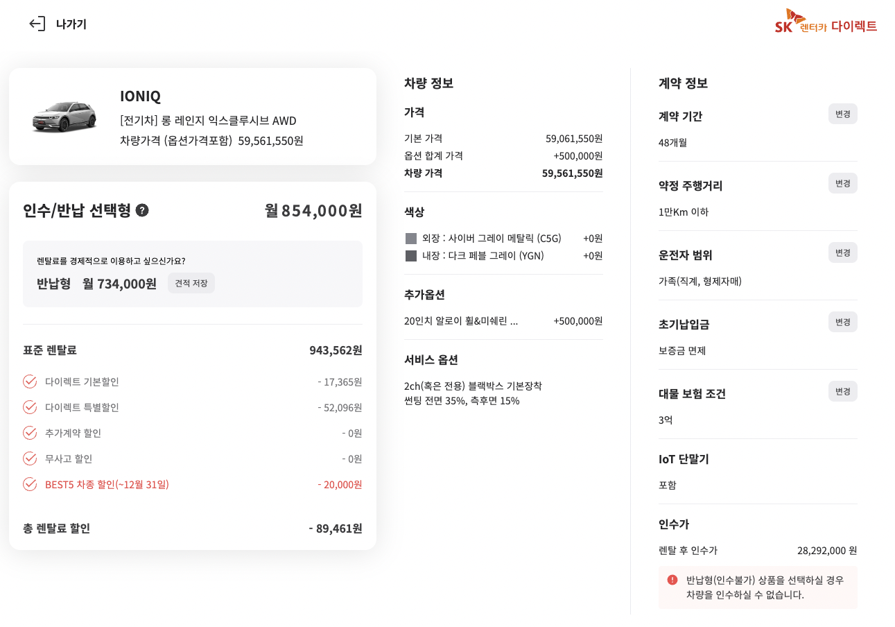 이렇게 쉽게 본인 인증과 차종선택, 계약조건, 보험 등을 고르고 나면, 월 렌탈료가 자동으로 계산된다. 그리고, 월 렌탈료는 전기차 보조금이 반영된 요금인데, 이렇게 전기차 보조금을 위한 복잡한 서류제출 같은 것도 필요 없다. 그리고, 아이오닉5 12월 인기 BEST 차종으로 매월 2만원씩 알뜰하게 추가 할인도 받을 수 있다.
