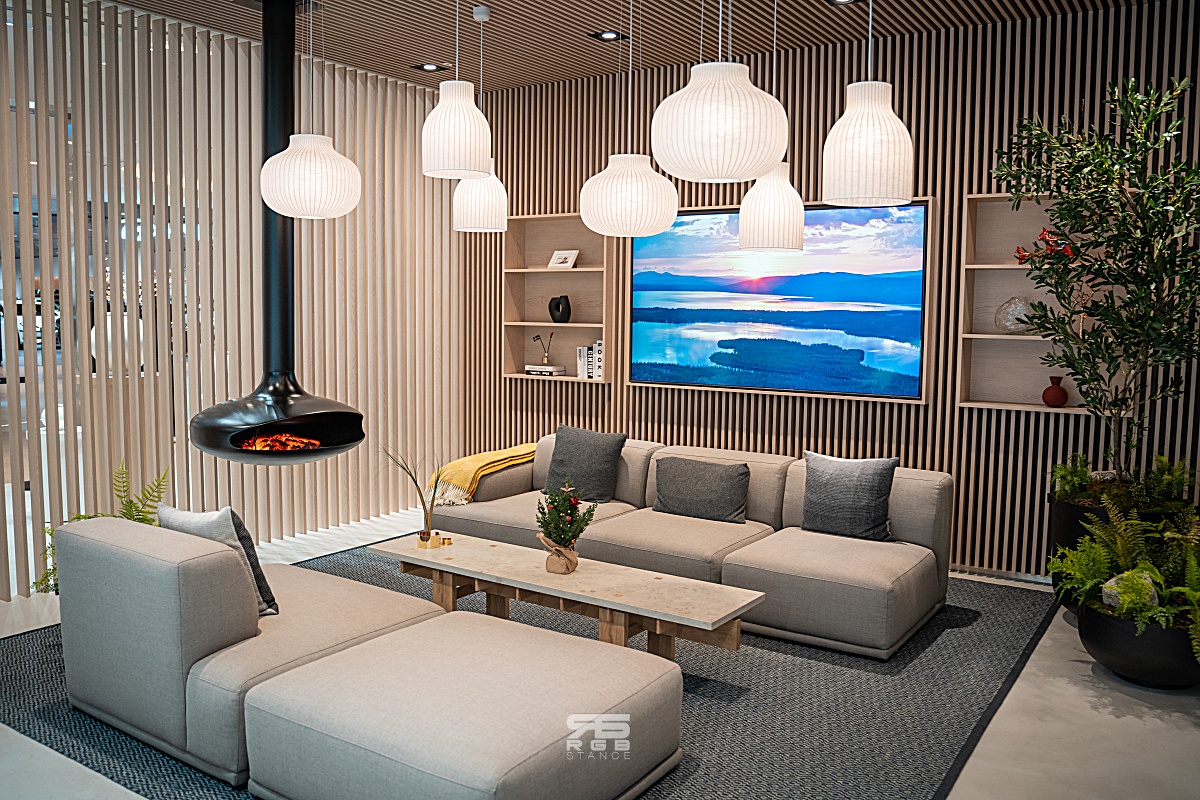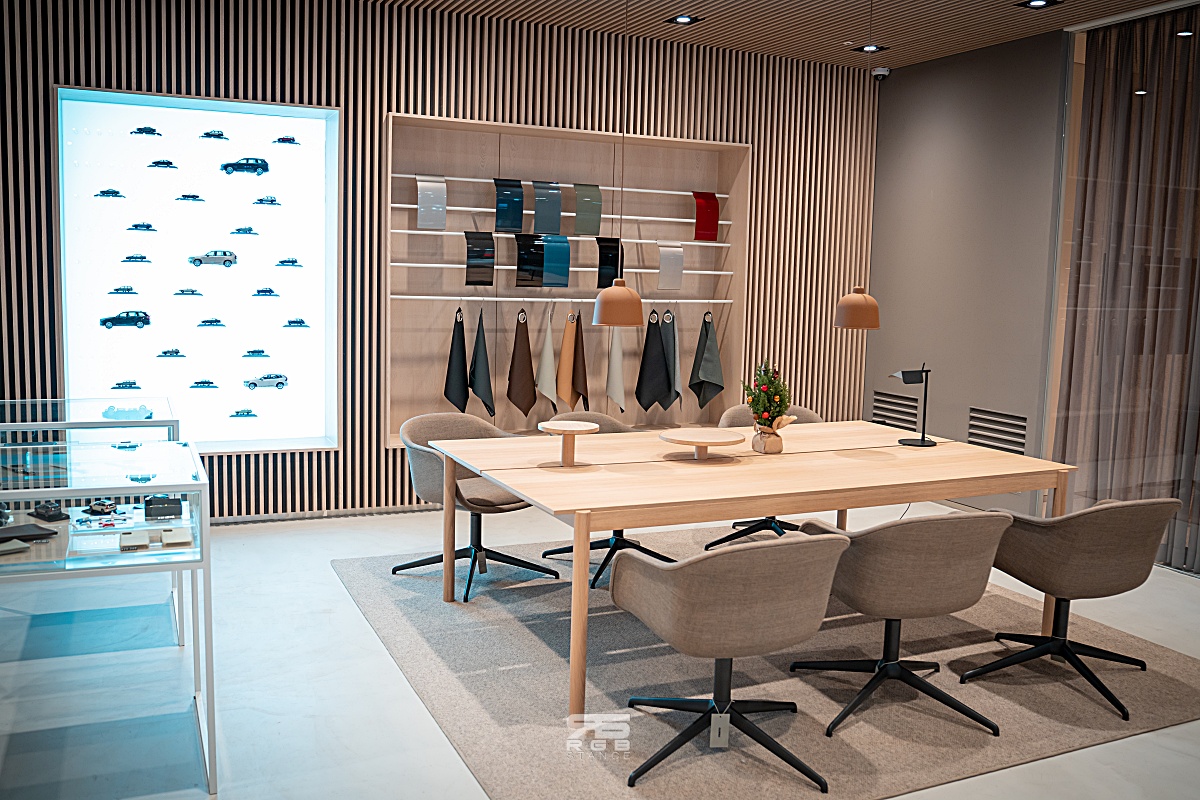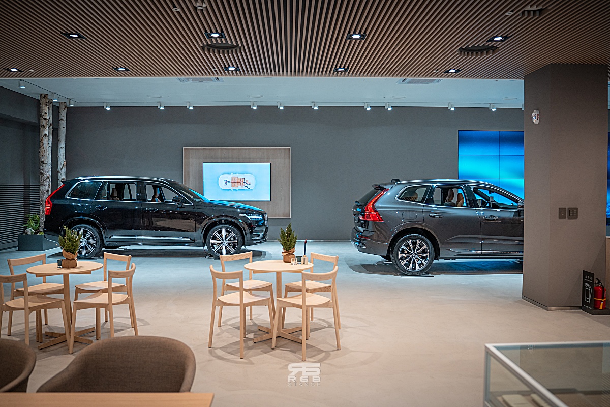 특히, 스칸디나비안 리빙 룸 형태의 개방형 공간은 마치 스웨덴 가정집 거실처럼 꾸며져 있고, 차량이 전시되어 있는 공간은 콘플러어 바닥으로 오롯이 차량에만 집중할 수 있는 분위기로 꾸며져 있다.