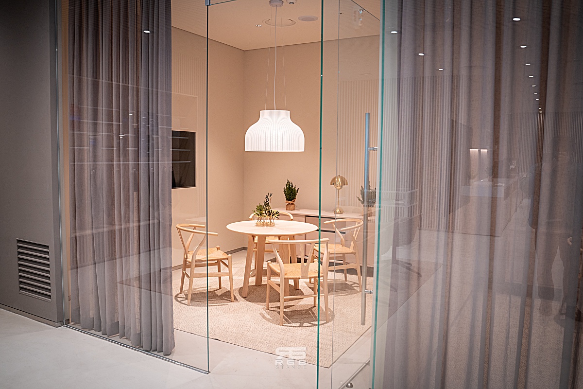 고객 라운지나 상담을 위한 공간은 너무나도 편안하고 따스한 느낌의 디자인을 선보이는데, 스웨덴에서 직수입한 가구와 애쉬우드로 마감한 인테리어와 벽난로 컨셉이 북유럽의 느낌을 받도록 만들었다.