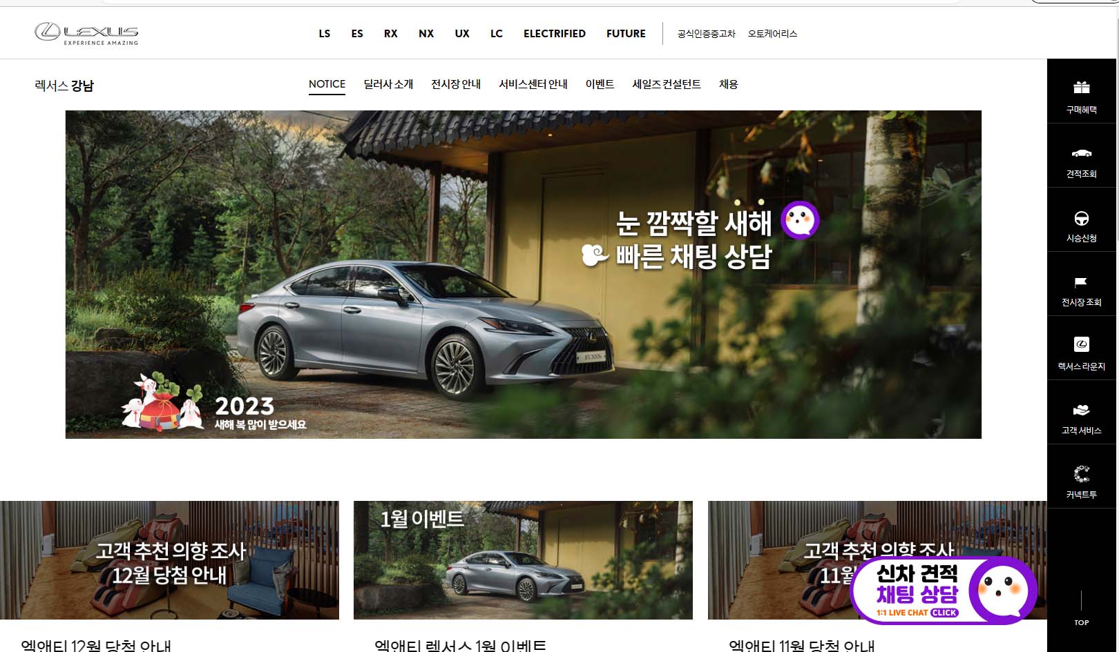 참고로, 엘앤티렉서스에서는 매달 다양한 이벤트를 진행하고 있는데, 지난 설 연휴에는 2023년 탁상달력과 윷놀이세트 등을 내방고객과 시승고객에게 각각 증정했고, 계약을 한 고객에게는 김포 쌀 10kg 을 증정하는 이벤트를 진행했었다. 이렇게 엘앤티렉서스의 홈페이지에서 채널톡 상담과 시승 외에도 매달 있는 다양한 이벤트를 경험해보는 것 또한 괜찮다.