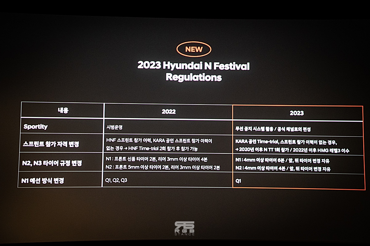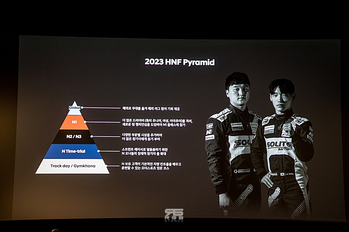 그리고, 2023년 N 페스티벌에 대한 설명이 있었는데, 전체적으로 작년과 같은 모습이긴 하다. N1 - 아반떼 N 클래스를 시작해 N2, N3 및 타임트라이얼로 시즌이 구성되며, 트랙데이 및 짐카나 행사가 추가되었고, N 브랜드를 보유한 오너에 한해 모터스포츠 입문을 위한 코스가 새로 개설된다는 점 또한 2023 시즌의 특징이다.