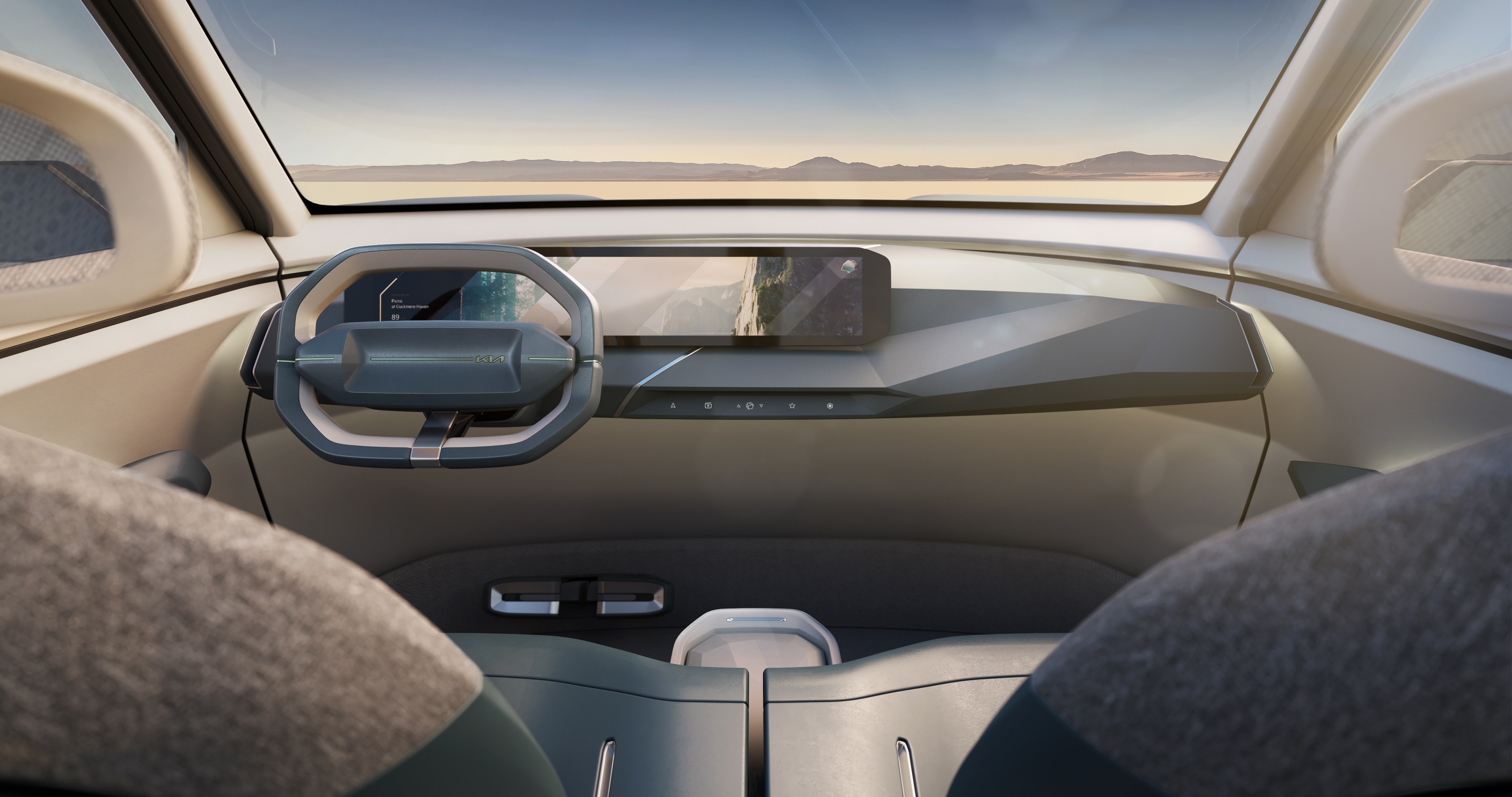 또한 회전 가능한 스위블링 시트를 비롯 테이블과 데크를 활용할 수 있는 트렁크 공간은 차량 안과 밖의 경계를 허물어 새로운 차량 경험을 제공한다. 이 밖에도 탑승객을 부드럽게 감싸는 형상의 랩어라운드 디자인 무드램프는 한층 더 고급스럽고 안락한 실내 분위기를 조성한다. 콘셉트 EV5를 통해 기아의 브랜드 비전인 지속가능한 모빌리티 솔루션도 엿볼 수 있다.