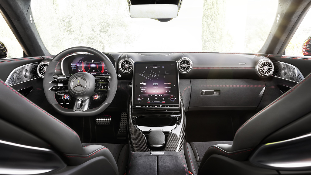 인테리어 또한 300 SL의 미니멀리즘 인테리어에 영감을 받아 아날로그와 최첨단 디지털 요소가 결합된 하이퍼아날로그(hyperanalogue)’를 구현하고 있다. 콕핏 디자인은 하이퍼아날로그 컨셉을 가장 잘 드러낸다. 제트기의 터빈 노즐에서 영감받은 송풍구 디자인은 12.3인치 운전석 계기반11.9인치 센트럴 디스플레이 등의 최신 디지털 요소와 조화를 이루며 독특한 분위기를 형성한다.