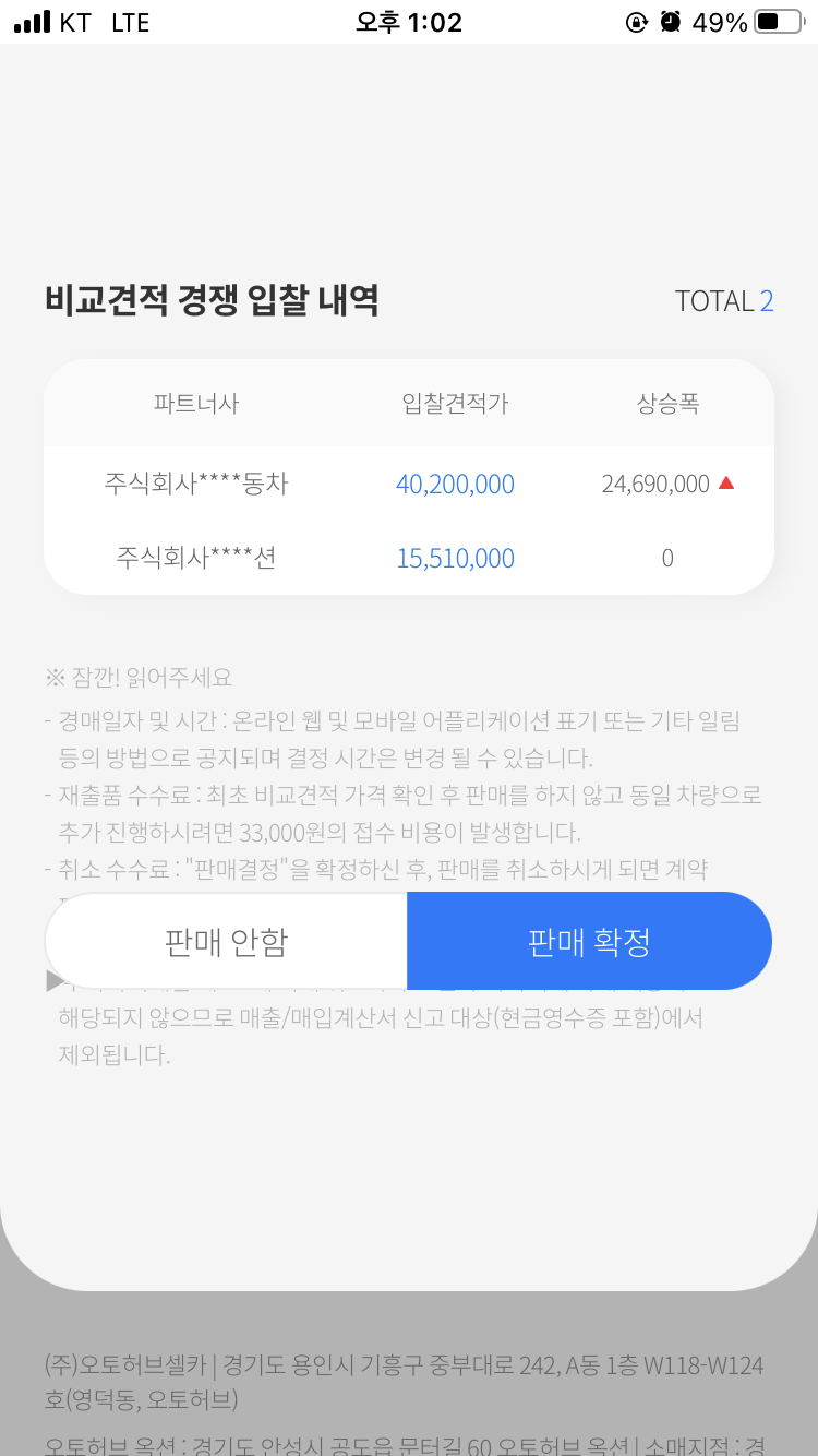 그리고, 차량등록증 확인 후, 차량의 정확한 상태를 확인하고 이러한 진단 내역을 바탕으로 전국의 회원사(상사) 들이 견적가를 제시하는 경매가 진행된다. 그리고, 경매 진행 후, 최고 견적가를 알려주며 판매여부를 결정하게 된다. 정말 간편하다.