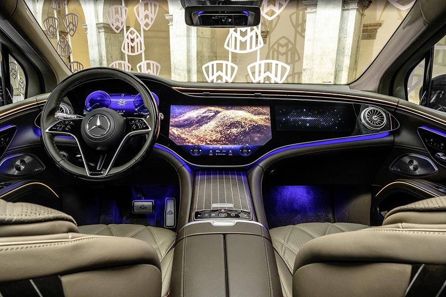메르세데스-마이바흐 EQS SUV의 인테리어 또한 장인 정신과 현대적 세련미가 강조됐다. 먼저 앞좌석에서는 3개의 디스플레이가 하나로 합쳐진 혁신적인 MBUX 하이퍼스크린(MBUX Hyperscreen)이 탑승객들에게 한 차원 높은 디지털 경험을 제공한다. 차량에 탑승하면 메르세데스-마이바흐 EQS SUV만을 위해 특별히 디자인된 전용 시작화면이 3개의 디스플레이에 등장해 탑승객을 반기고, 제로-레이어(Zero-layer) 인터페이스가 적용돼 사용자에게 필요한 기능을 맞춤형으로 제공한다. 또한, 계기반 내 마이바흐(MAYBACH) 모드를 별도로 설정 가능한 점도 특징이다.