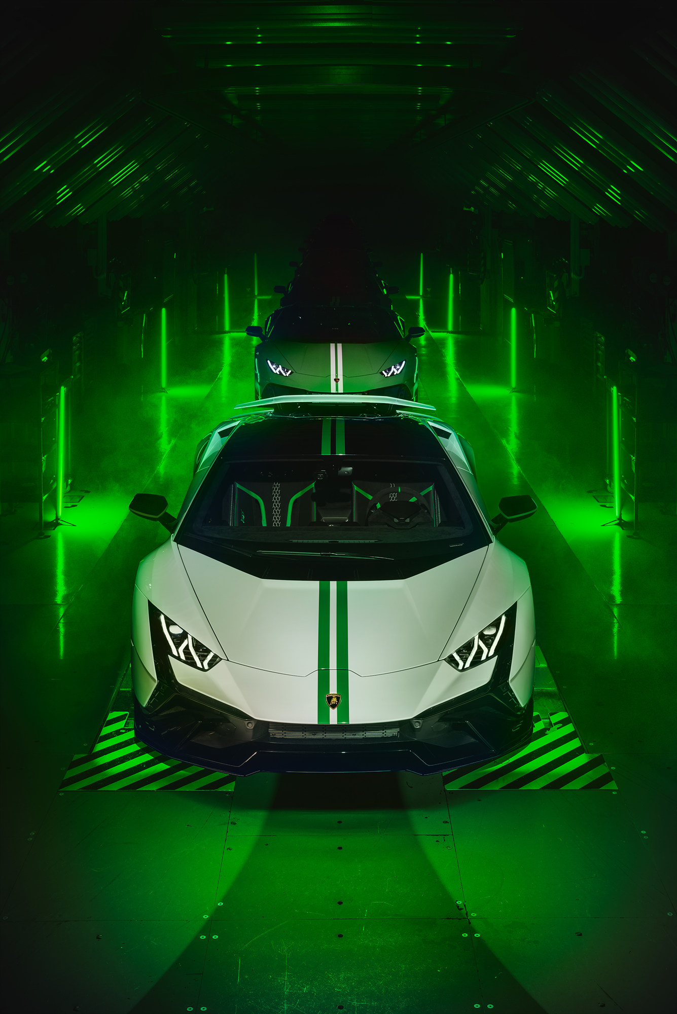 우라칸 STO(슈퍼 트로페오 오몰로가타)는 자연 흡기형 V10 엔진을 탑재해 우라칸 라인업 중 퍼포먼스의 정점을 보여준다. 60주년 기념 에디션은 두 가지 버전으로 제공되며, 모두 고성능 스포츠웨어와 팀 컬러에서 영감을 받아 톤온톤 형태로 컬러감을 매치했다. 첫 번째 모델은 블루 컬러를 특징으로 하는데 블루 아이게우스(Blu Aegeus)의 차체 색상에 블루 아스트라이오스(Blu Astraeus) 컬러 요소로 장식되며 블루 미라(Blu Mira) 마감의 노출된 탄소섬유와 조화를 이룬다.