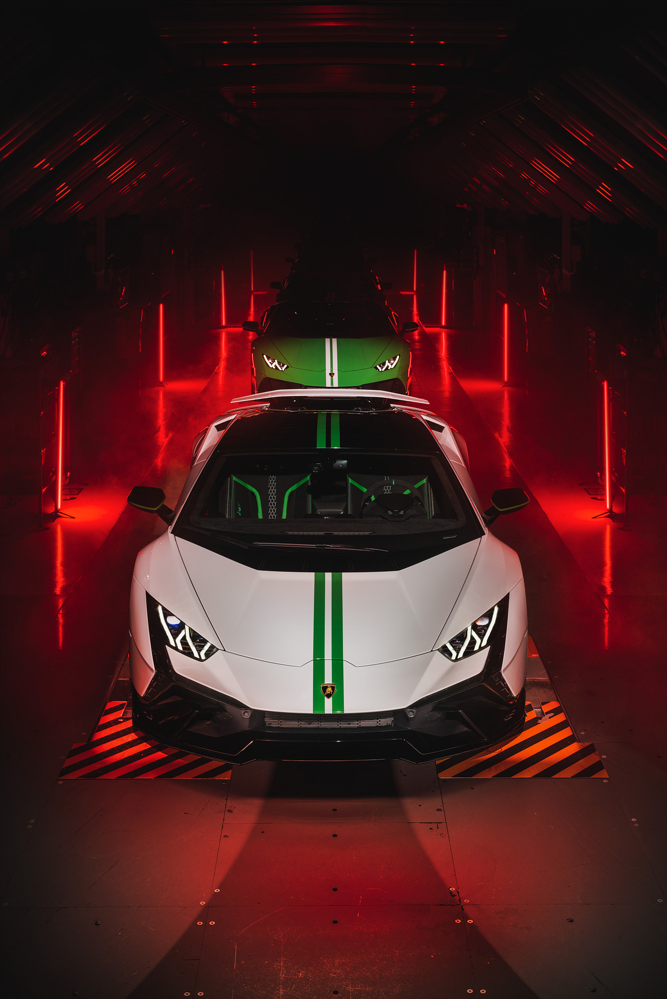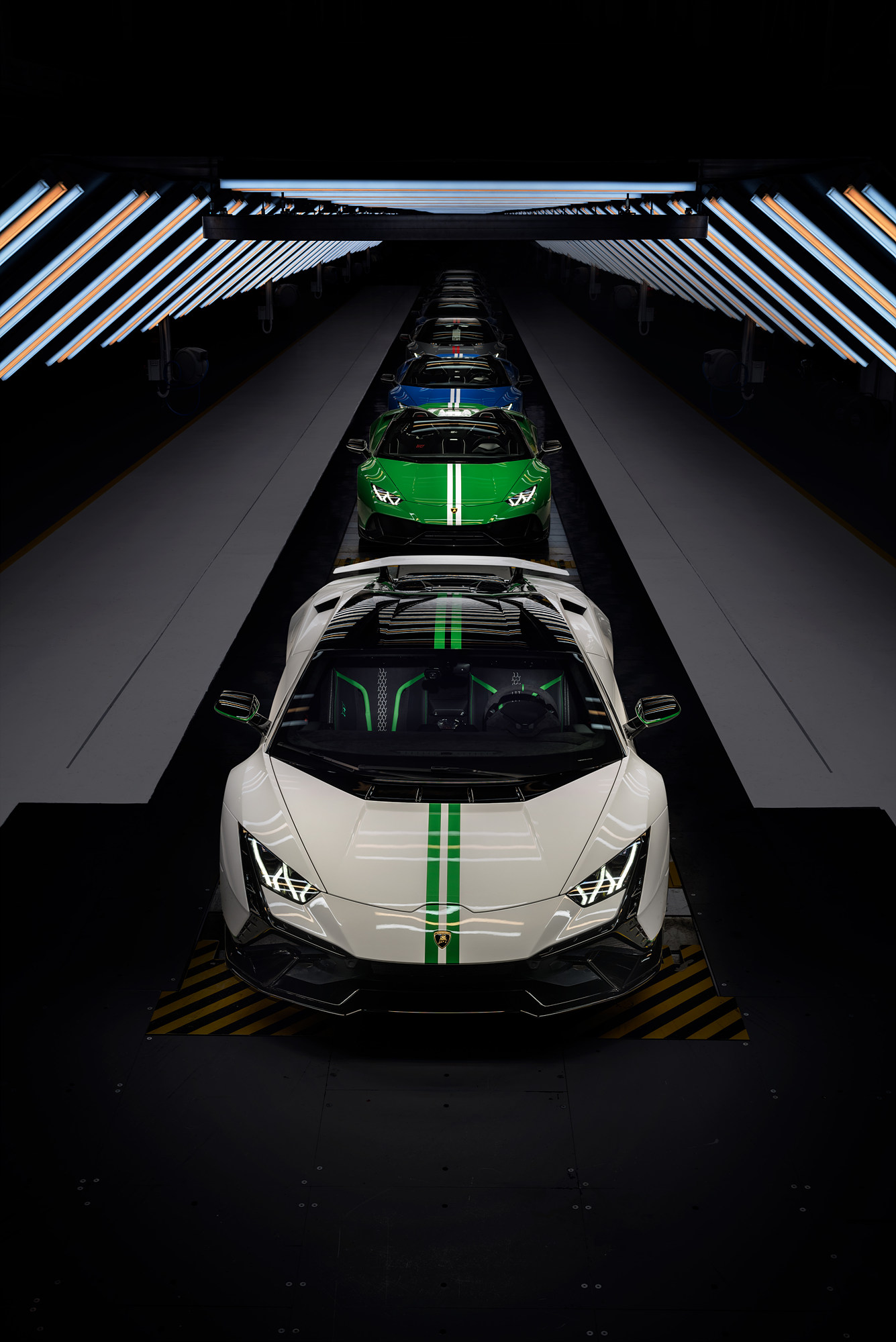우라칸 STO(슈퍼 트로페오 오몰로가타)는 자연 흡기형 V10 엔진을 탑재해 우라칸 라인업 중 퍼포먼스의 정점을 보여준다. 60주년 기념 에디션은 두 가지 버전으로 제공되며, 모두 고성능 스포츠웨어와 팀 컬러에서 영감을 받아 톤온톤 형태로 컬러감을 매치했다. 첫 번째 모델은 블루 컬러를 특징으로 하는데 블루 아이게우스(Blu Aegeus)의 차체 색상에 블루 아스트라이오스(Blu Astraeus) 컬러 요소로 장식되며 블루 미라(Blu Mira) 마감의 노출된 탄소섬유와 조화를 이룬다.