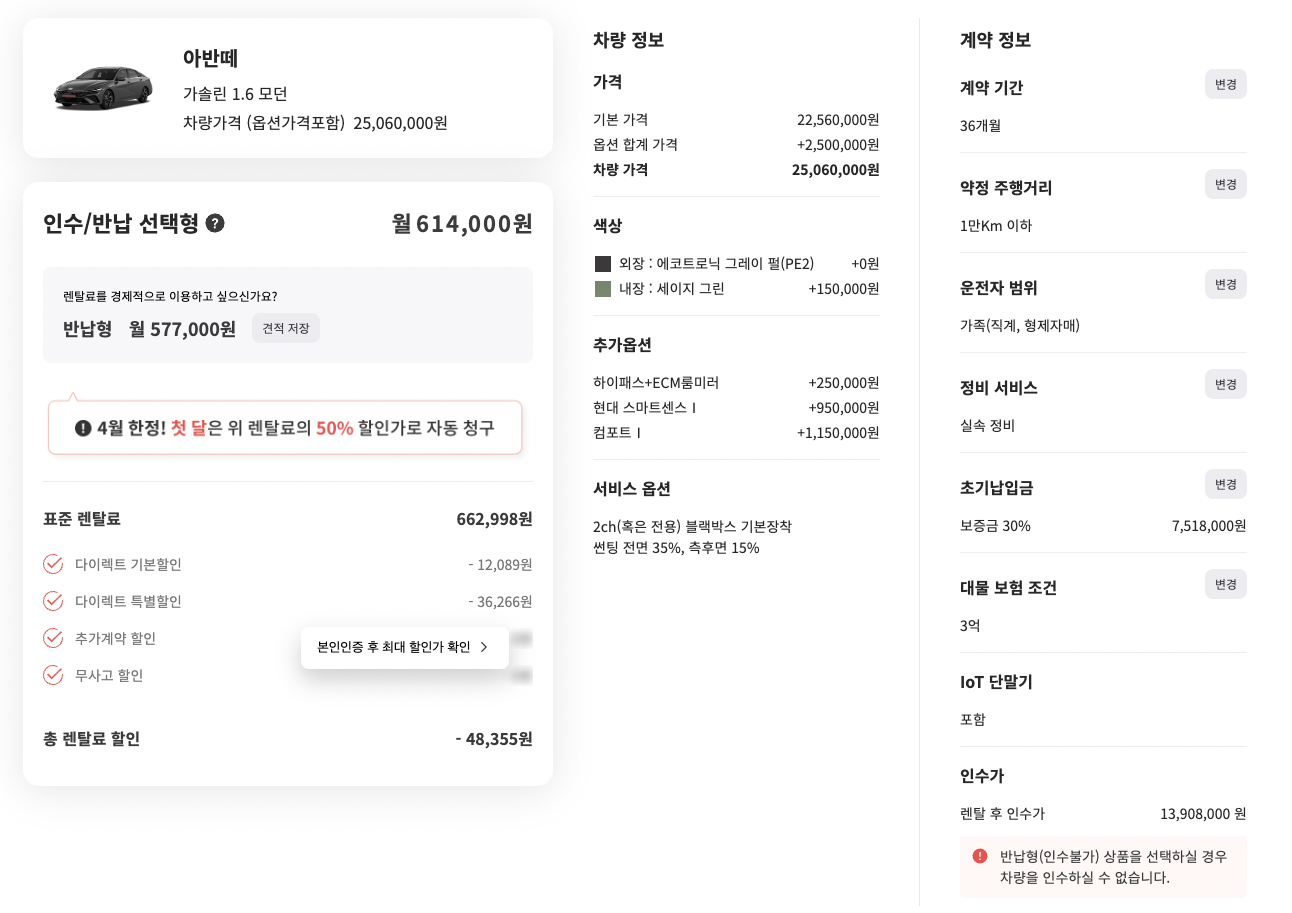 반도체 부품 이슈가 가라앉고 차량 출고가 비교적 빨라졌다고 하더라도 현재 더 뉴 아반떼의 출고 대기기간은 약 3개월 정도이며, 신차 계약시 목돈 부담이 될 수 있는데, 이 두 문제를 해결하기에는 SK 렌터카 다이렉트 장기렌트카를 추천해볼 수 있다.