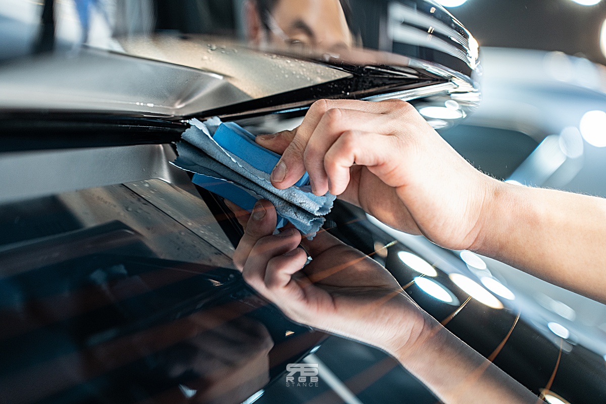 유막제거 작업을 하고 나서 물을 뿌려보면 유막제거가 제대로 되었는지 확인할 수 있는데, 친수성을 띄면 제대로 유막제거가 완료된 것으로 확인하고, 다시 한번 차량을 닦아준 후 확실하게 물기 제거를 해주고 유리 발수코팅 작업을 시작한다.