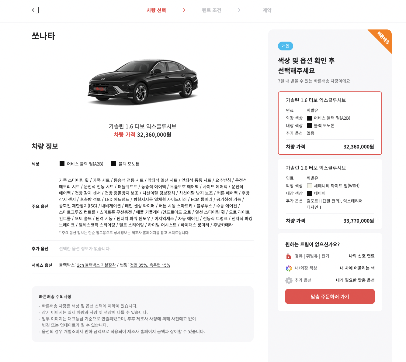 그리고, 이런 국민 중형세단 쏘나타를 일반 신차 계약보다 빠르고 목돈 부담없이 출고받으려면, ‘SK렌터카 다이렉트 신차 장기렌트카’를 추천한다. SK렌터카 다이렉트에서는 출고 가능한 실시간 재고를 바로 보여주며, 계약 후 7일 이내 빠른 출고가 가능하다(송도 인수센터로 직접 방문시 더 빠른 출고 가능). 또한, 금리인상 등으로 차량 인수가 부담된다면, 계약 종료 후에는 차량을 반납하는 반납형 상품을 선택해 인수 선택형 대비 월 렌탈료를 더 저렴하게 이용할 수 있다.