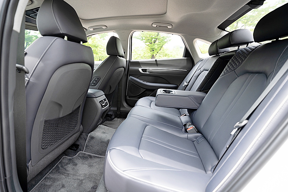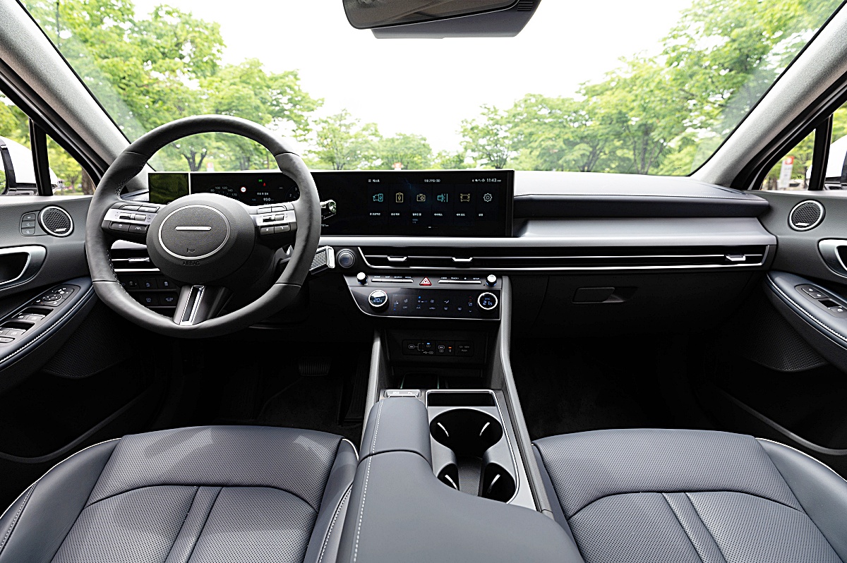 실내의 경우에는 12.3인치의 디지털 클러스터와 인포테인먼트 시스템으로 구성된 ‘파노라믹 커브드 디스플레이’ 가 적용되면서 실내를 더욱 와이드하게 보이게 만들면서 모던하면서도 하이테크한 모습을 연출해주고 있다. 기어노브도 칼럼타입의 전자식 변속기로 바꾸면서 실내 공간을 더욱 여유롭게 만들었고, 2열 공간 역시 중형세단 쏘나타다운 여유로운 모습이다.