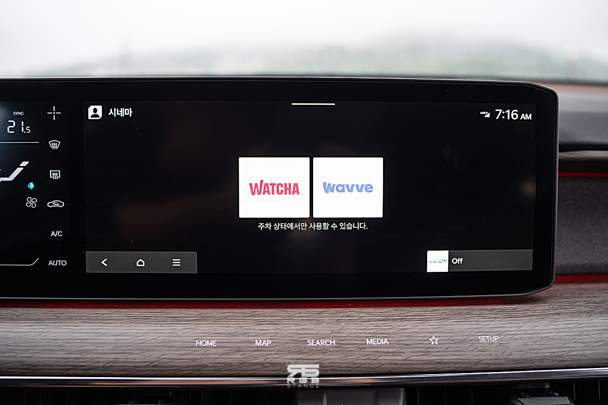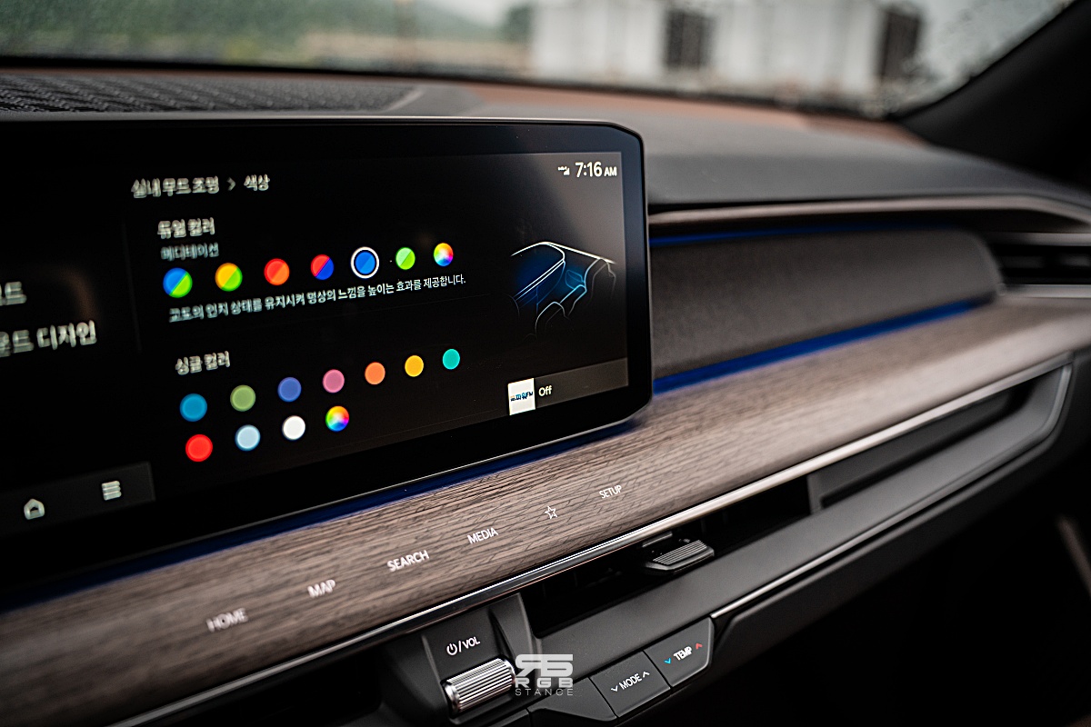 디스플레이에 사용되는 UI 는 깔끔하고 직관적이다. 편의사양으로 왓챠, 웨이브, 멜론 등 OTT 서비스를 즐길 수 있고, 앰비언트 라이트는 고급스러운 감성을 만들어준다. 그리고, 컬럼 타입의 전자식 변속 레버에 전원스위치가 있는 점은 꽤 독특하다.