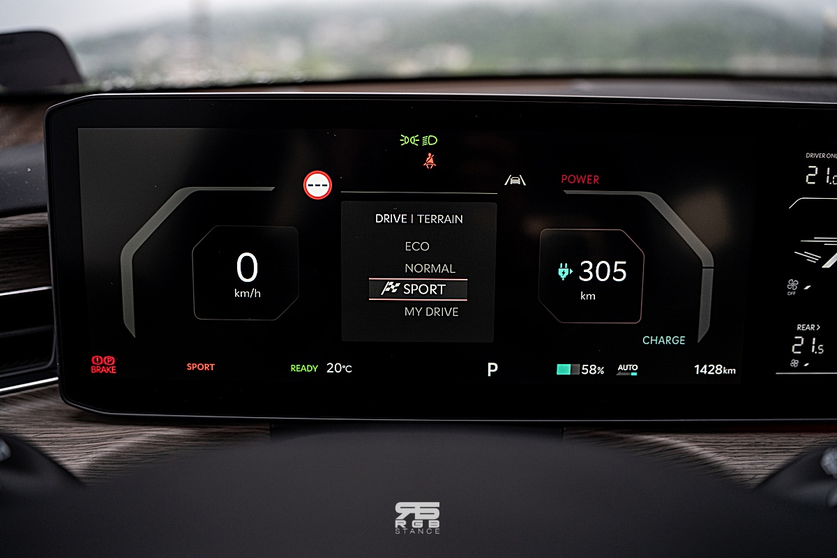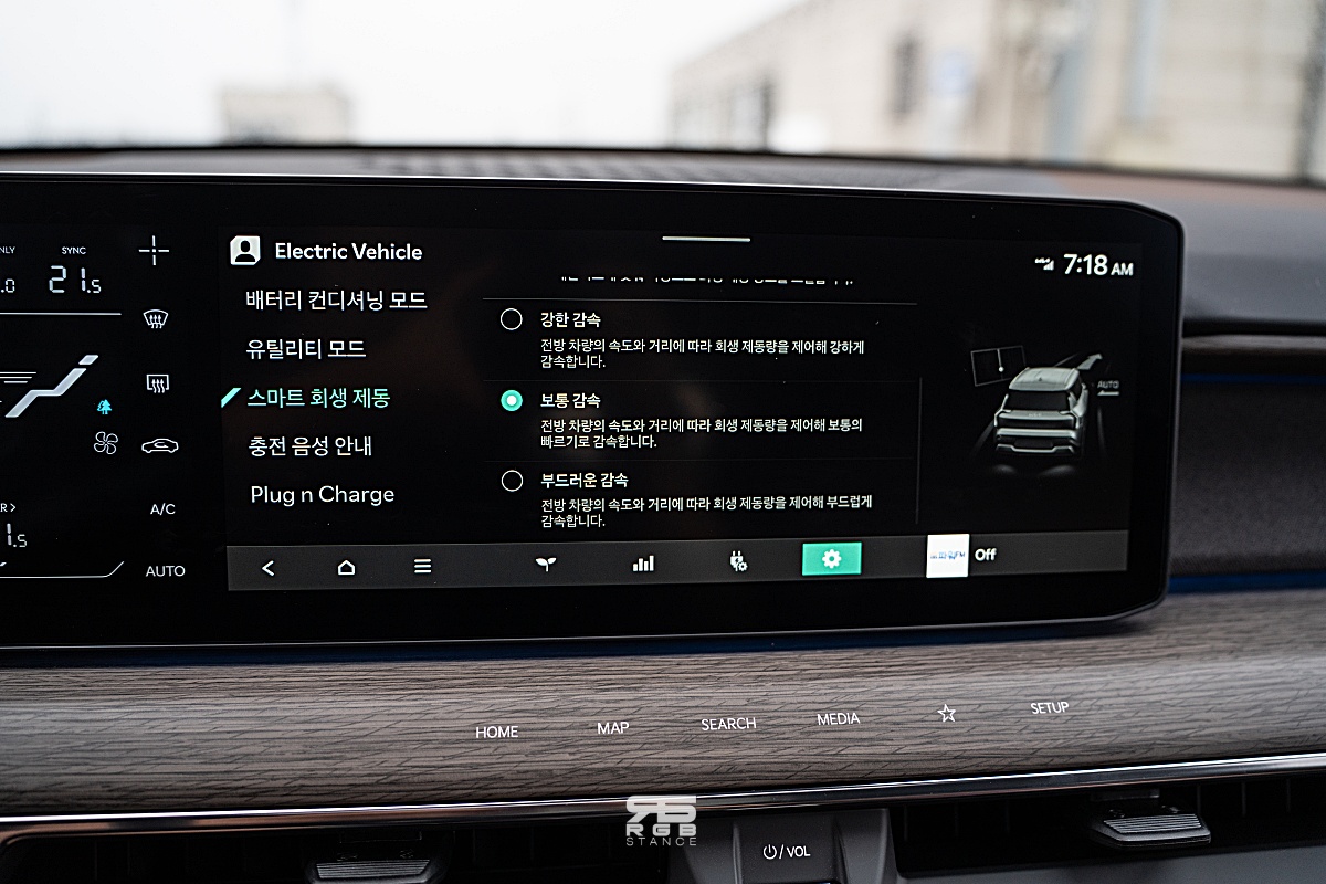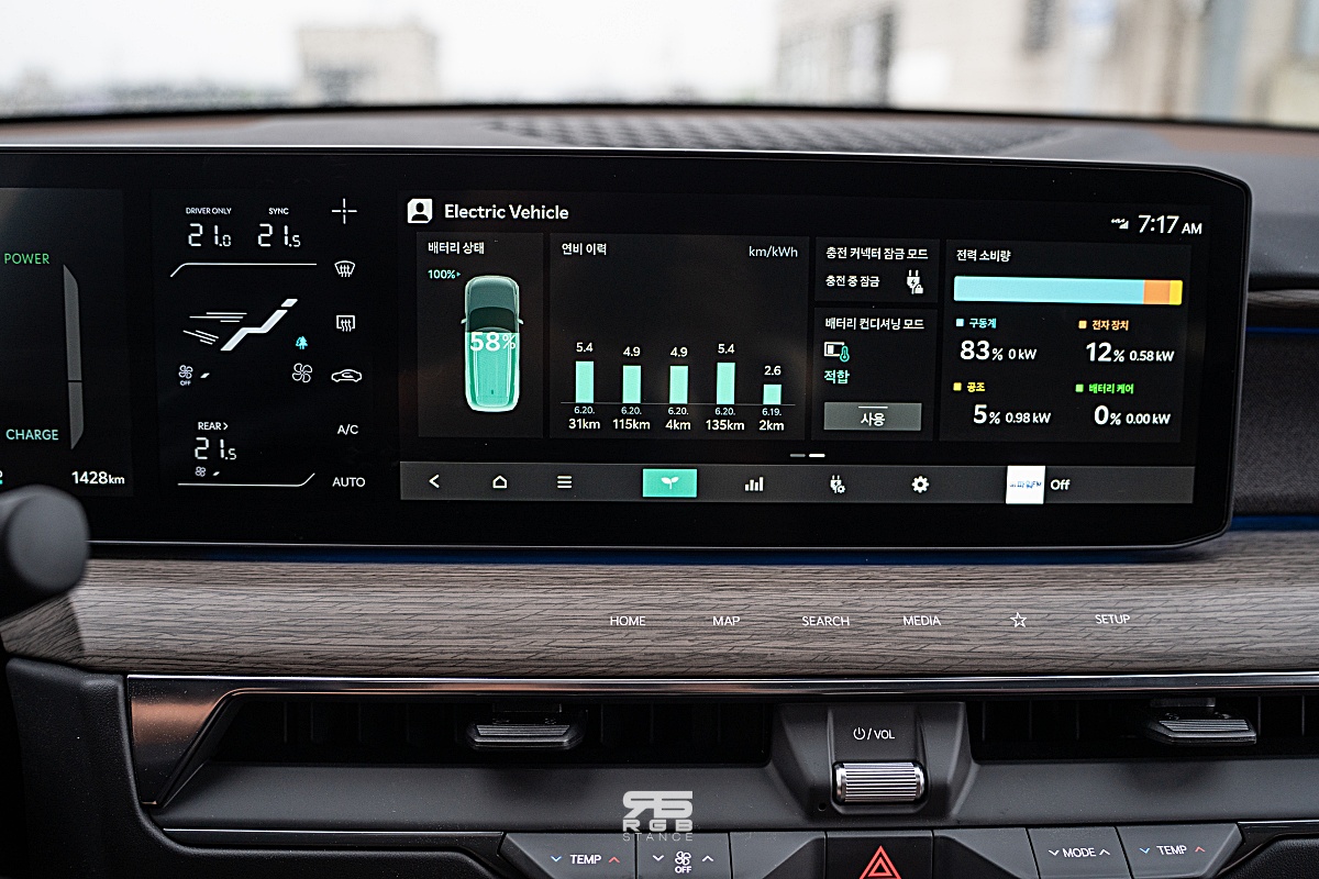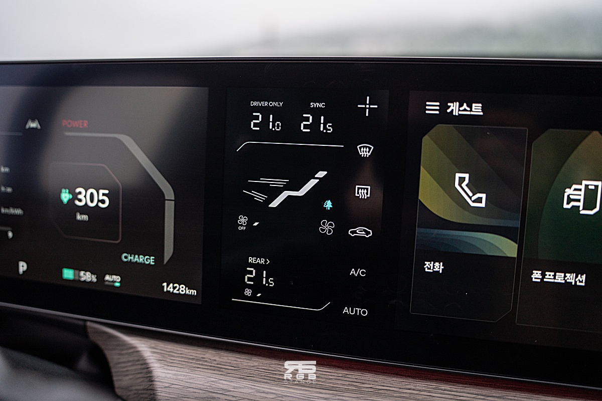 시승한 4WD 모델은 99.8kWh 배터리로 1회 충전시 최대 502km 의 거리를 주행할 수 있다(21인치 휠 기준) 그리고, 최고 283kW(380마력), 최대 600~700Nm(부스트 옵션시 700Nm)의 토크로 공차중량 2.6톤의 EV9 을 가볍게 움직여준다(카니발보다 400kg 정도 더 무겁다). 에코모드에서도 130km/h 이 넘어가면 시트가 편안히 옆구리를 잡아주며, 조용하면서도 묵직하게 가속되는 EV9 을 타고 도로에 나가면 직선도로에서 상당히 편안하고 안정적이다.