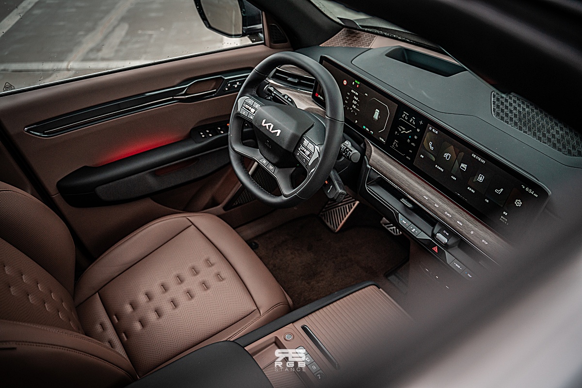 EV9 의 첫 인상은 굵직함이다. 5,010mm 의 전장과 3,100mm 의 휠베이스, 1,980mm 의 전폭으로대형 SUV 답게 큰 존재감을 보여주는데, 옆모습을 보면 굵직한 모습은 더 강하게 느껴진다. 디지털 패턴 라이팅 그릴과 밤하늘의 별자리를 형상화한 스타맵 LED DRL 은 미래지향적인 모습을 보여주면서, 직선이 강조된 모습이 모던함을 느끼게 해준다. 그리고, LED 램프 역시 전면부와 통일감을 보여주는 한편, 와이드한 숄더 라인과 사이드의 볼륨감은 차량의 덩치를 느끼게 하기에 충분한 요소들이다. 이런 모던하고 굵직한 존재감을 보여주는 외관과 함께 주목해야 할 부분은 바로 실내다.