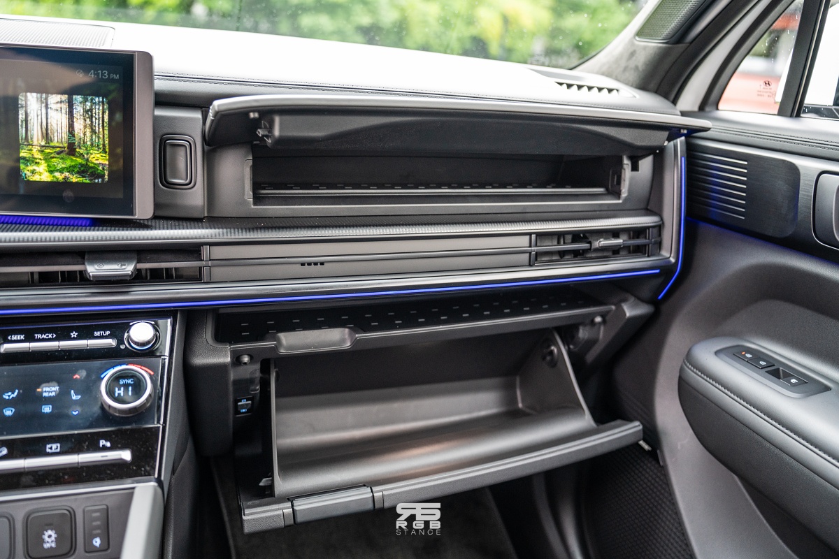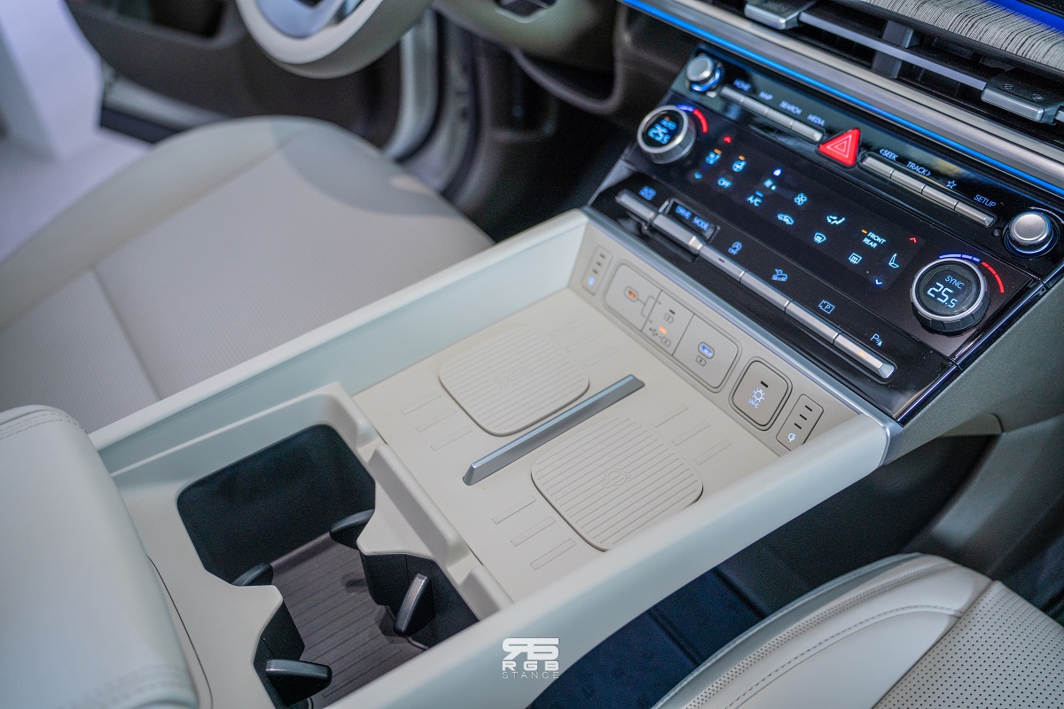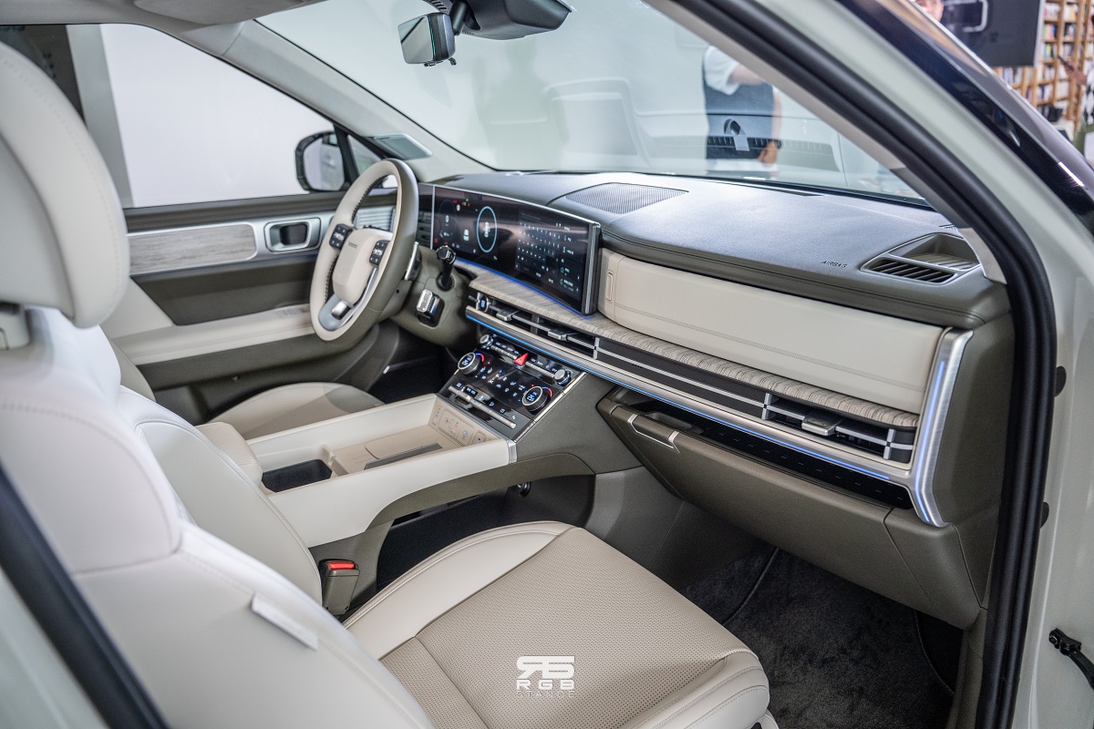 실내에도 H 형상의 디자인이 대시보드와 송풍구 및 시트에도 적용되어 있는데, 너무 과한 것은 아닌가 싶을 정도로 많긴 하다. 하지만, 고급스러운 나파가죽 시트와 함께 컬럼 타입 전자식 변속 레버를 사용해 실내 공간을 넓게 활용할 수 있게 하였고, 쏘나타에서 선보였던 파노라믹 커브드 디스플레이가 운전자의 시인성과 고급감을 향상시켰다. 이 외에도 엠비언트 무드램프가 도어트림 하단, 크래시 패드 가니쉬, 커브드 디스플레이 하단 등에 적용되어 안락한 분위기를 만들어내준다. 그리고, 3열까지 총 12개의 컵홀더가 있고, 물병을 넣을 수 있는 포켓까지 수납공간은 화려하다.