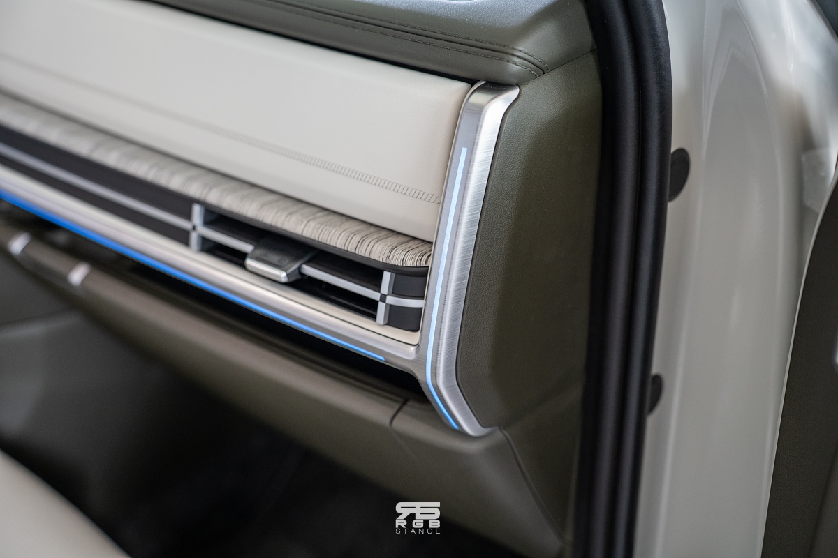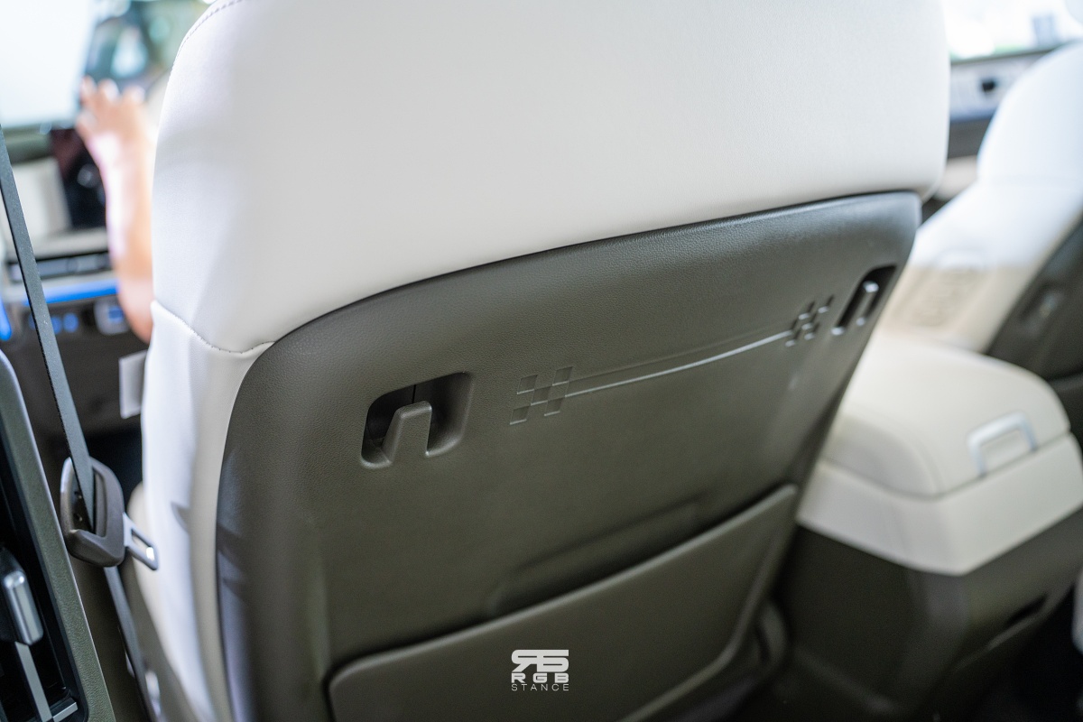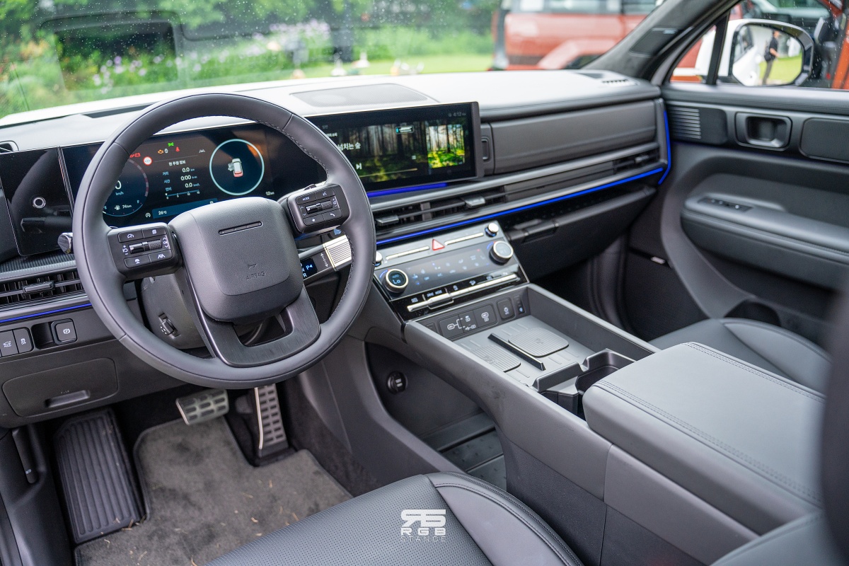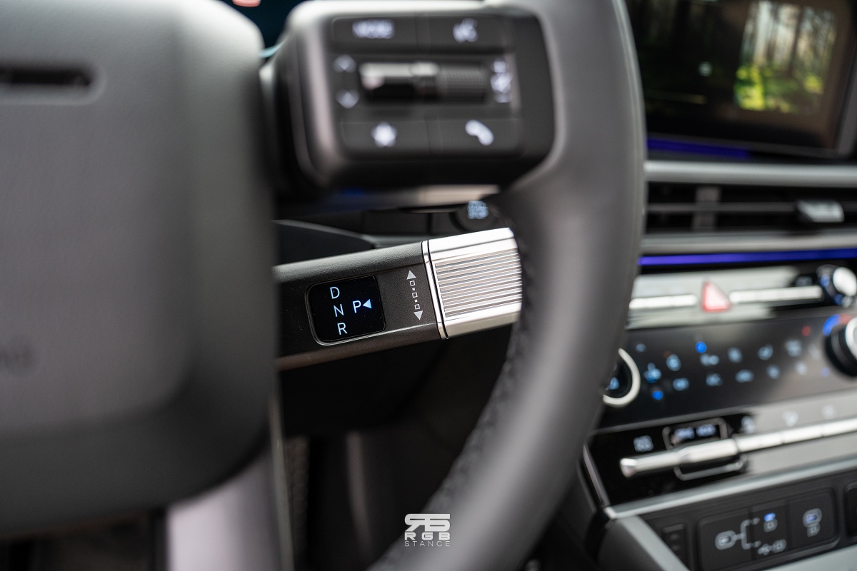 실내에도 H 형상의 디자인이 대시보드와 송풍구 및 시트에도 적용되어 있는데, 너무 과한 것은 아닌가 싶을 정도로 많긴 하다. 하지만, 고급스러운 나파가죽 시트와 함께 컬럼 타입 전자식 변속 레버를 사용해 실내 공간을 넓게 활용할 수 있게 하였고, 쏘나타에서 선보였던 파노라믹 커브드 디스플레이가 운전자의 시인성과 고급감을 향상시켰다. 이 외에도 엠비언트 무드램프가 도어트림 하단, 크래시 패드 가니쉬, 커브드 디스플레이 하단 등에 적용되어 안락한 분위기를 만들어내준다. 그리고, 3열까지 총 12개의 컵홀더가 있고, 물병을 넣을 수 있는 포켓까지 수납공간은 화려하다.