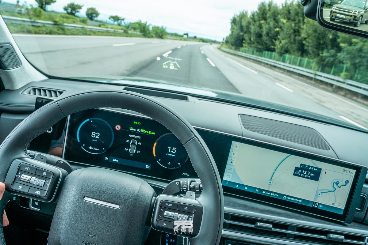 그리고, 2.5 가솔린 터보엔진의 성능도 궁금할텐데, 싼타페의 성격은 패밀리카. 스포츠카가 아닌 만큼, 반응이 즉각적이진 않다. 정지 상태에서 풀악셀을 쳐도 조금 있다가 반응을 하게 되는데, 이러한 세팅은 급격한 차량 조작으로 인한 사고 방지나 편안한 승차감을 위한 세팅으로 보여진다. 하지만, 주행을 하면서 점차 속도를 올리면. 특히, 드라이브 모드를 ‘SPORT’ 모드로 바꾸면 에르고 모션시트가 옆구리를 꽉 잡아주면서 고속주행에서도 안정감 있는 모습을 경험하게 된다. 고속 주행시 SUV 특성상 무게중심이 높아 불안할 것으로 예상했지만, 꽤 고속에서도 안정적이고 묵직한 그립력을 보여주어, 사륜구동에서의 트랙션 컨트롤이 더해지면 어떤 느낌일지 기대가 되는 수준이었다.