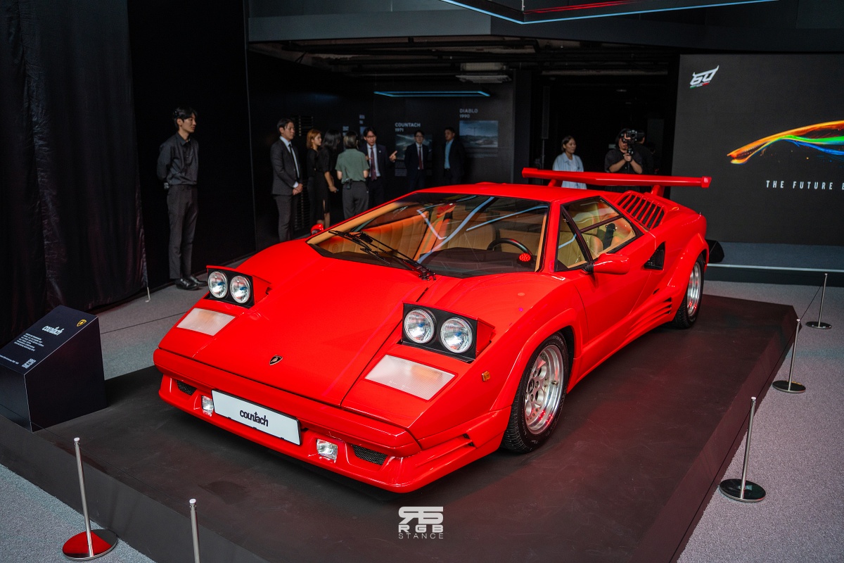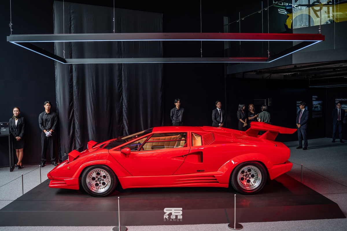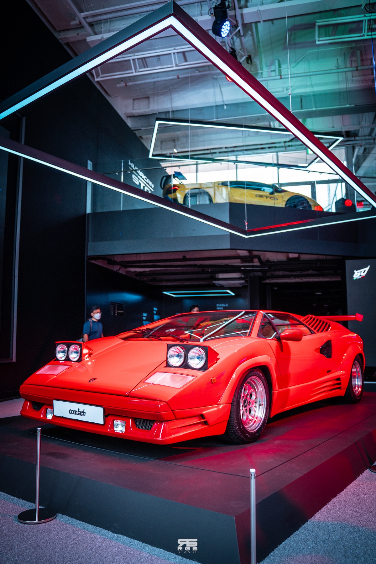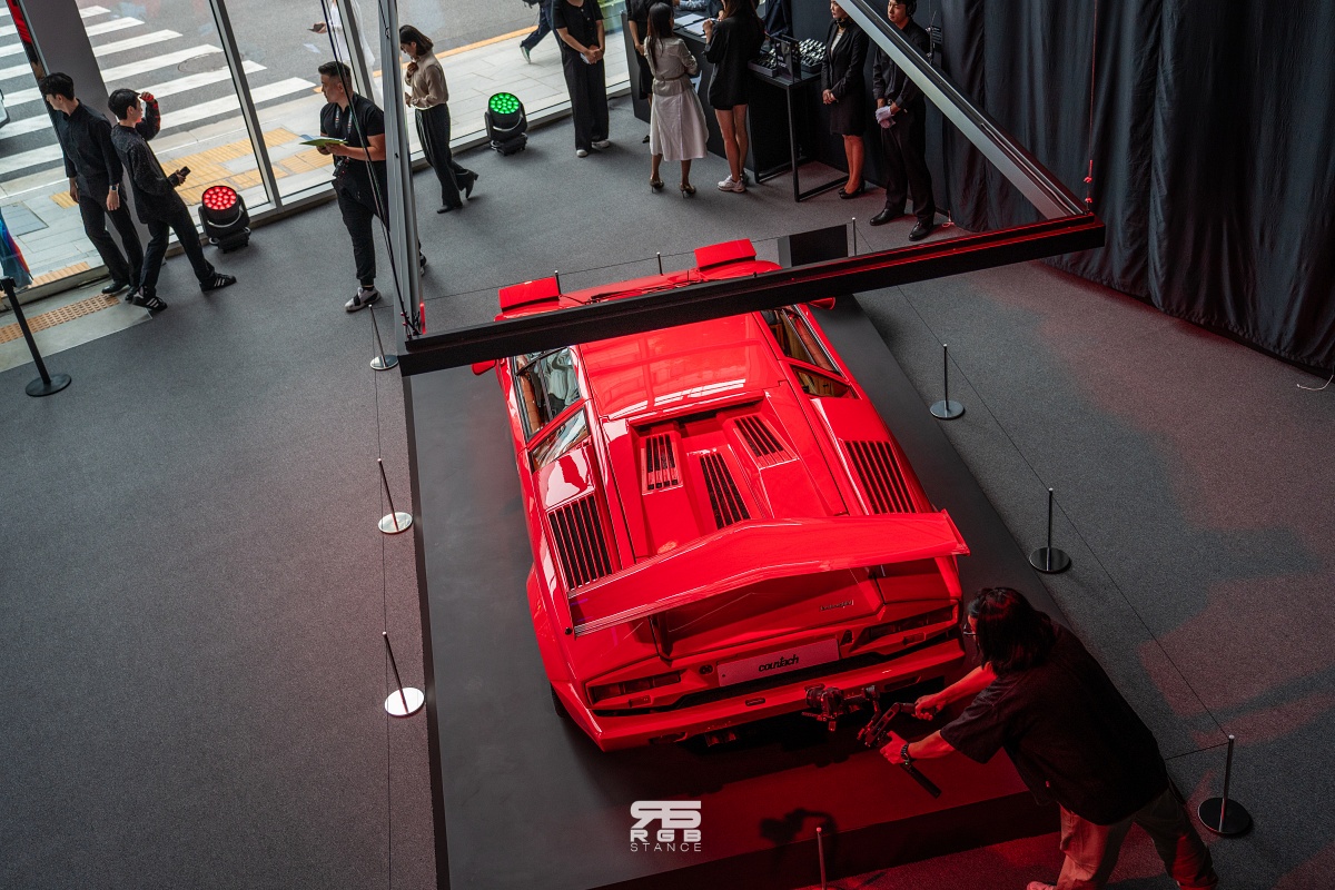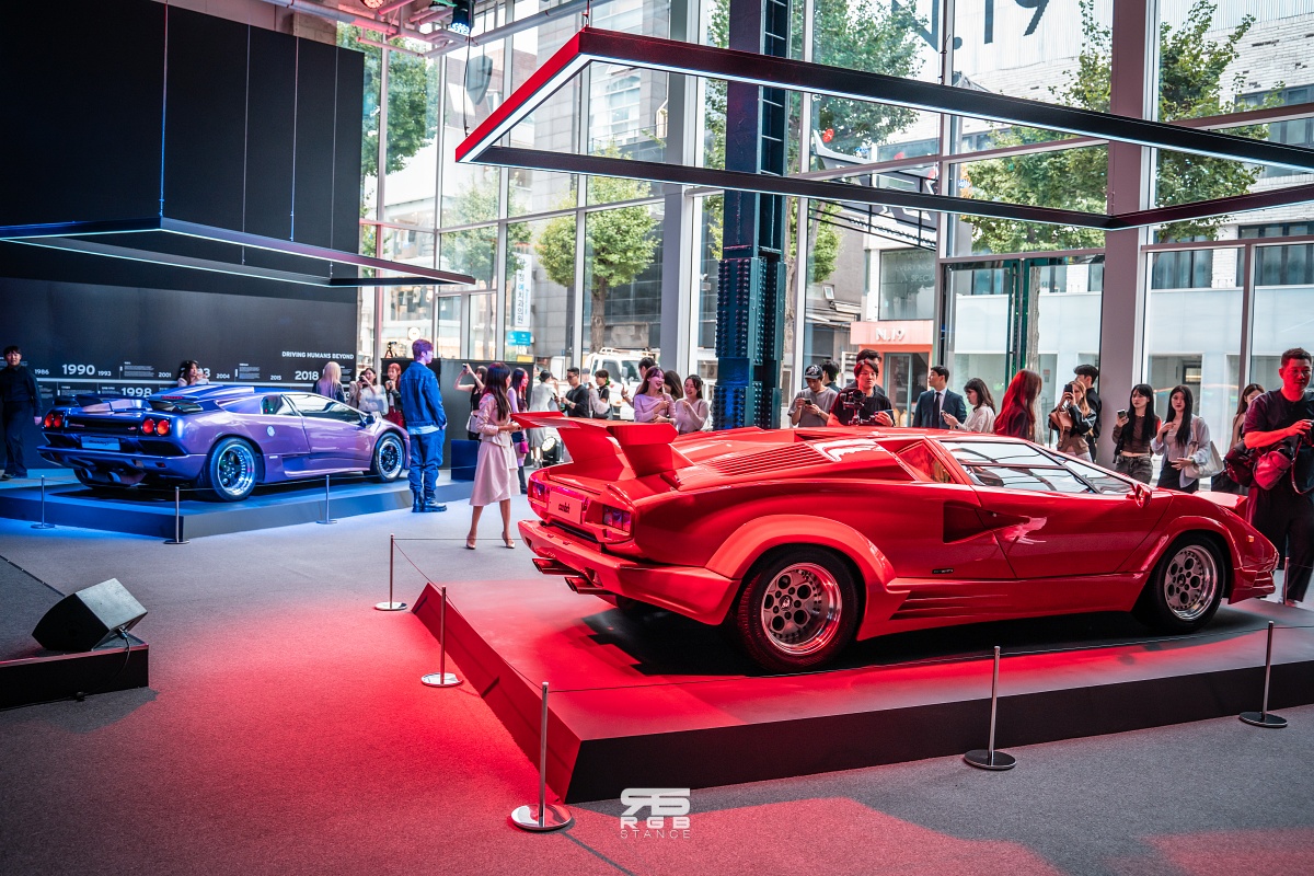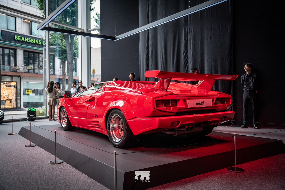 우선, 팝업라운지 1층에는 쿤타치와 디아블로 SV 가 전시되어 있다. 쿤타치는 1971년 제네바 모터쇼에서 콘셉트카로 등장해 미래지향적인 디자인과 혁신적인 세로배치 엔진, 람보르기니의 트레이드마크가 된 시저 도어를 최초로 선보여 열광적인 반응을 얻었다. 이런 호응을 바탕으로 쿤타치는 1973년부터 생산에 돌입했으며, 쿤타치의 진보적인 설계와 디자인은 오늘날까지 이어지는 람보르기니의 아이덴티티로 자리잡았을 뿐만 아니라 이후 만들어진 여러 미드십 스포츠카의 설계와 디자인에 지대한 영향을 미쳤다. 전시된 쿤타치는 최근 보배드림에서 화재가 되 었던 차량으로, 희소성이 매우 높은 모델 중 하나다.