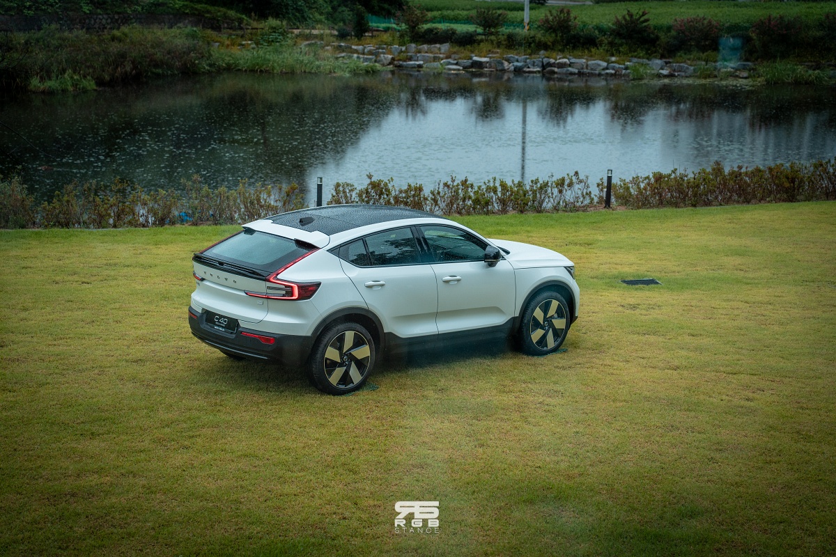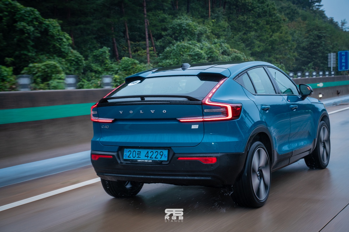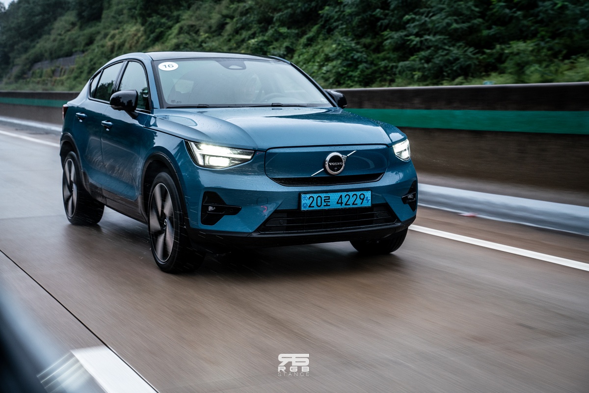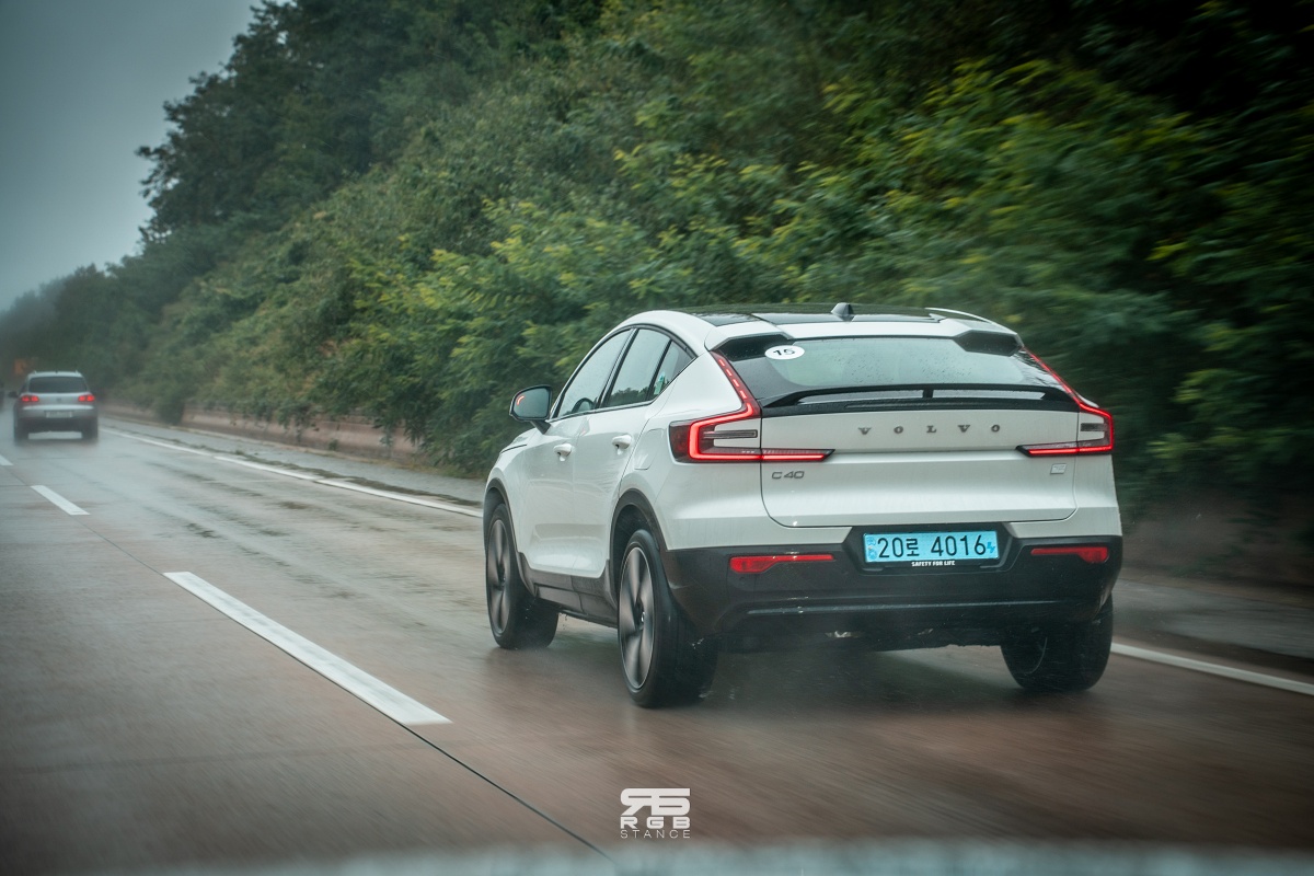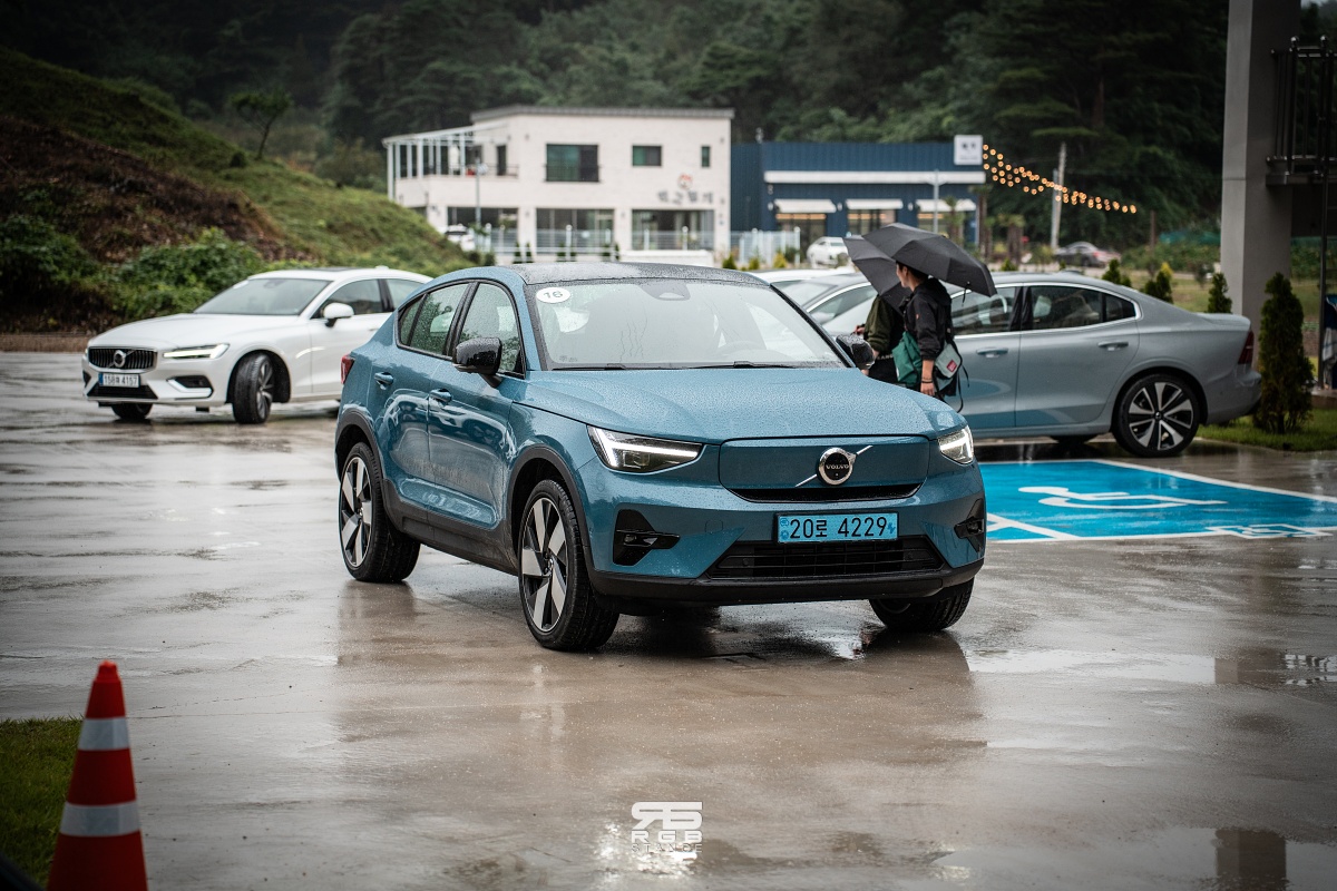 이제 휴식 및 체험행사를 마치고서는 돌아가는 길에 C40 리차지로 바꿔서 주행하기로 했다. 시승한 C40 리차지는 2024년식 모델로, 전륜 모터가 영구자석에서 무자석방식의 고효율 모터로 바뀌었고, 후륜 모터에는 고효율 인버터를 사용해 전후륜 총합 408마력으로 23년식과 동일한 출력을 보여준다. 하지만, 23년식 C40 리차지는 전륜 204마력, 후륜 204마력이었던 것에 비해, 24년식 모델은 전륜 150마력, 후륜 258마력으로 바뀌었고, 토크 역시 23년식은 전후륜 33.7kg.m 에서 24년식은 전륜 25.5, 후륜 42.8kg.m 로 바뀌어 후륜중심의 사륜구동으로 바뀐 것이 특징이다. 주행가능거리는 356km 에서 407km 로 51km 가 늘어났다.
