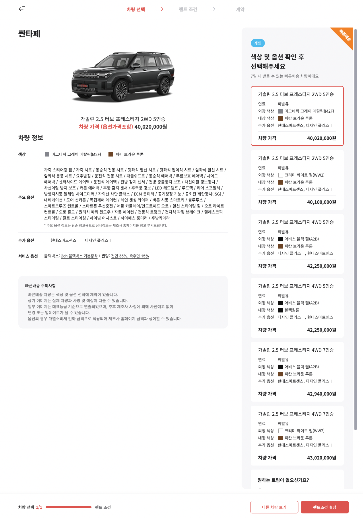 SK렌터카 다이렉트 신차장기렌터카를 이용하는 방법도 너무나 간단하다. SK렌터카 다이렉트 홈페이지에서 차량을 선택하고, 납입조건이나 보험 등의 조건들을 선택하고 나면 월 렌탈료가 계산되고, 여기에서 계약을 하면 끝이다. 너무나 간단한 만큼, 신차 계약보다 빠르고 목돈 부담없이 국민 SUV 싼타페를 1주일 내에 출고받고 싶다면 SK렌터카 다이렉트 신차장기렌터카를 이용해보길 추천한다.
