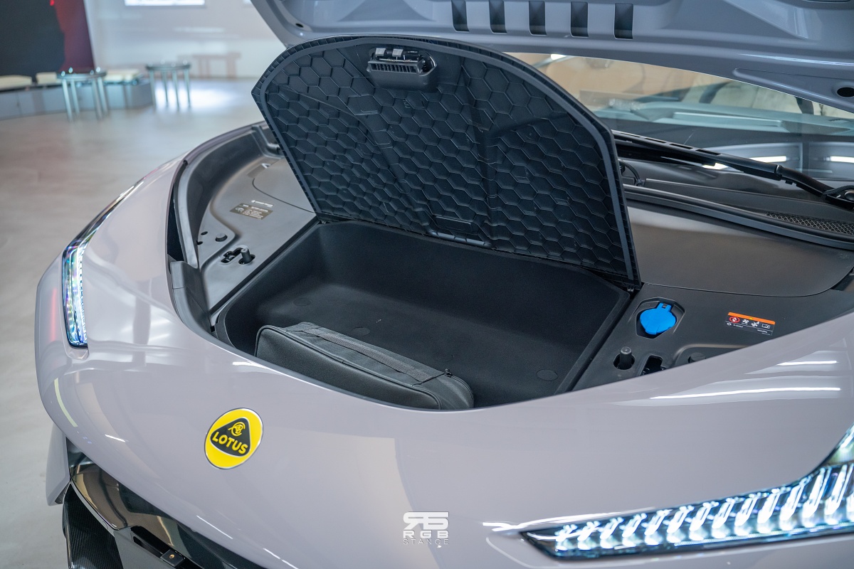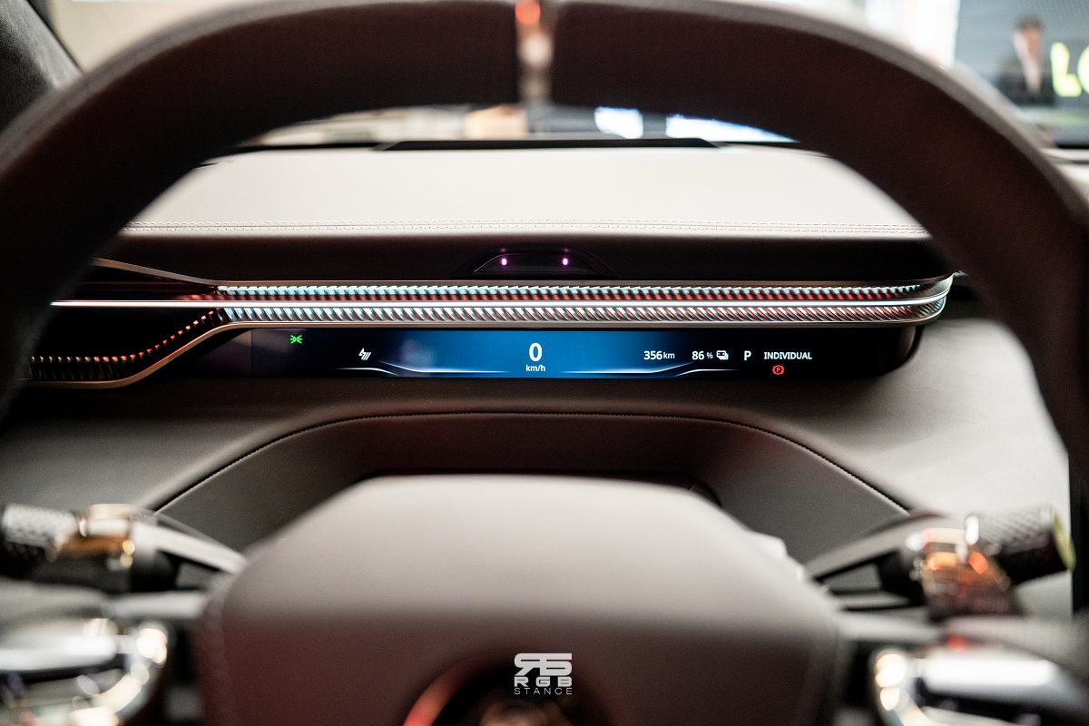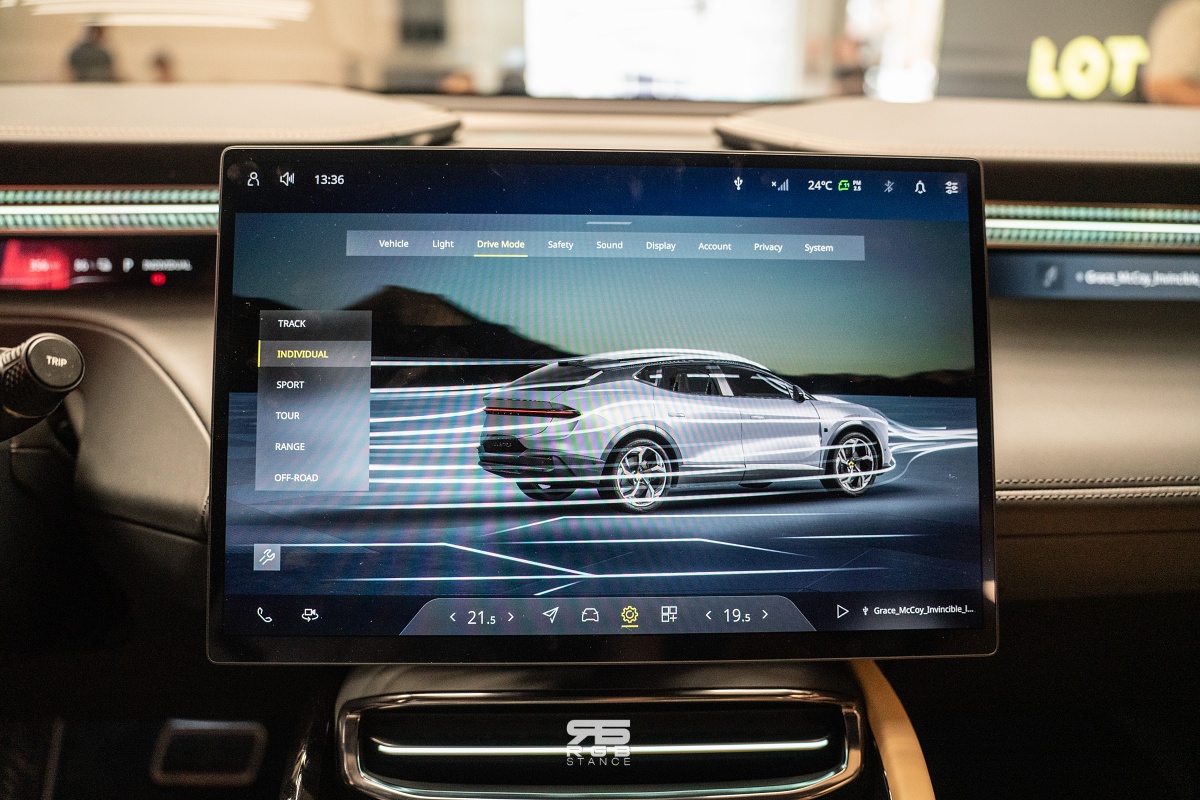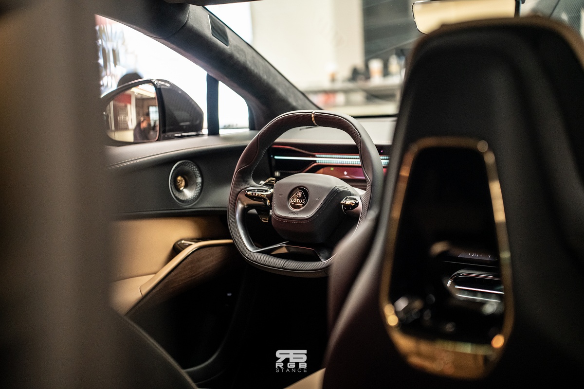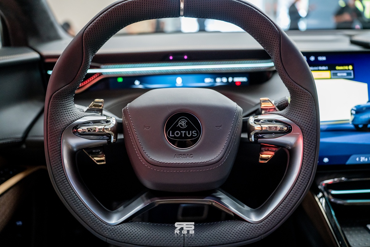 실내로 들어와보면 더욱 놀라게 된다. 드라이빙을 위한 것을 제외하곤 아무것도 없던 로터스와 달리, 럭셔리한 분위기와 구성들에 놀라게 되는데, 고급스러운 가죽과 스웨이드로 장식된 실내는 넓고 안락해졌으며, 슬림형 15.1인치 HD OLED 터치스크린을 통해 선명하고 깨끗한 이미지를 보여주고 있고, 대화형 피드백 기반의 OS 가 적용되어 직관적인 운전 경험을 느끼게 해준다. 스마트폰 무선충전 기능은 물론, 스티어링휠 뒷쪽의 12.6인치 HD OLED 계기판은 증강현실 기능을 갖춘 29인치 HUD 와 함께 운전을 더욱 안전하게 할 수 있도록 도와주며, 파노라믹 글라스 루프는 디지털 기술을 적용해 10단계의 투과율 조절이 가능하다.