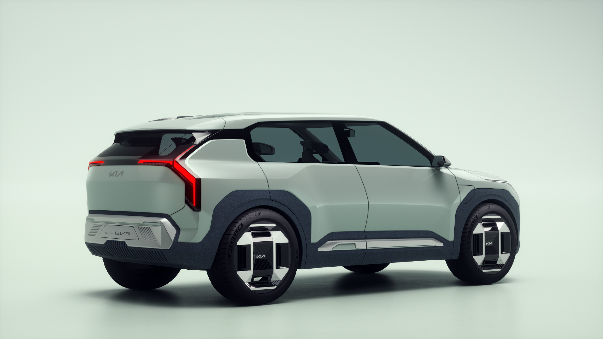 EV3 는 강인하고 역동적 루프라인의 실루엣을 보여주는데, 볼륨감 있는 차체면과 새로운 EV 타이거 페이스를 적용해 미래지향적이면서도 기술적 완성도를 높여주고 있다. 특히, 측면부에는 사각형을 비대칭적으로 깎은 듯한 휠 아치 구조가 강인해보이며, 후면부의 기하학적 조화를 이룬 리어 펜더와 볼륨감이 느껴지는 테일게이트는 전면부와 통일감을 보여주고, 넓은 공간감과 미래지향적 분위기를 만들어낸다.