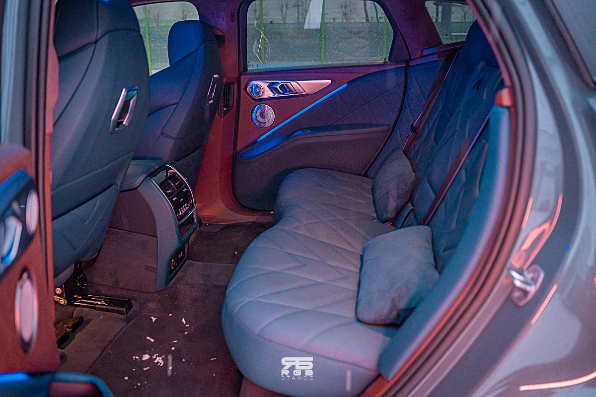 BMW XM 의 실내로 들어오면 삼차원 프리즘 형태의 일루미네이티드 헤드라이너가 다양한 색상을 보여주며 환상적인 느낌을 만들어준다. 그리고 체형에 맞춰 완벽한 조절이 가능한 편안한 시트는 고급스러운 가죽과 함께 스티칭 패턴 및 독특한 색감으로 미래지향적인 느낌을 강조하며 럭셔리함을 연출해준다.
