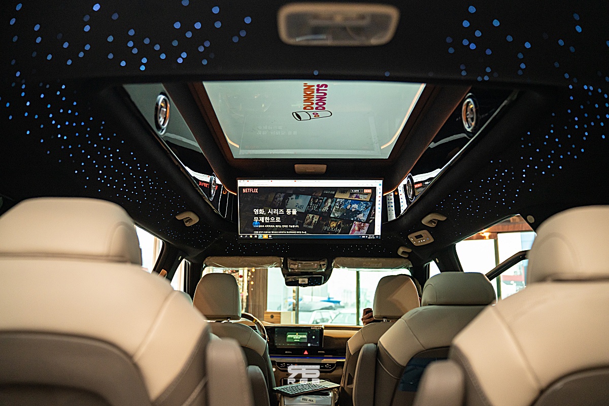 또한, 일반적인 하이리무진처럼 하이루프가 적용되어 있는데, 하이루프를 통해 충분한 실내 공간을 확보하면서도 슬림해 보이는 이미지를 만들어주며, 하이루프 후면에 시인성이 뛰어난 면발광, 확산형 브레이크등이 적용되어 안전에도 신경을 썼다. 또한, 루프에 적용된 55인치 천장 모니터를 위해 윈도우 시스템이 적용된 PC 를 적용해 55인치 천장모니터에 여러 이미지나 영상 등을 노출시킬 수 있는데, 기업 의전용이라면 기업 로고 등을 적용시킬 수 있다. 기존 타 업체들의 안드로이드 시스템과 비교하면 안정성이나 속도 면에서 확실한 차이가 나는 부분이다. 이 외에도 스타라이트 헤드라이너와 함께 감성 넘치는 공간연출도 가능하다.