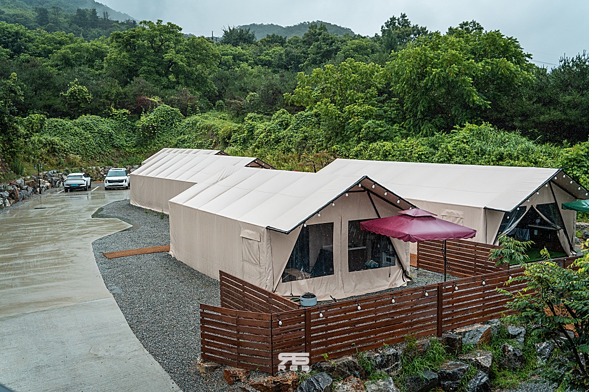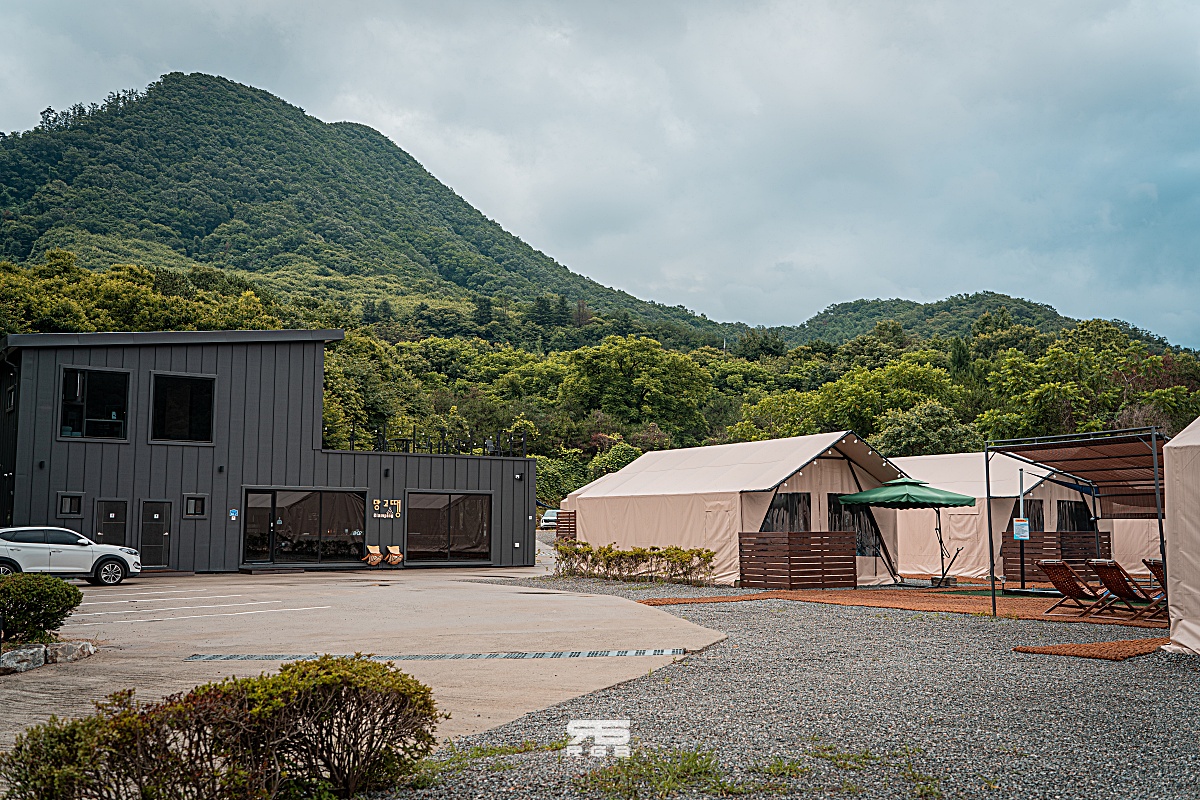입구마다 안내표지판이 세워져 있어서 찾기에도 어렵지 않은데, 약 1,300평 규모의 글램핑장으로 들어서면 사무실과 매점건물이 위치하고 있으며, 9개의 A동, 3개의 B동으로 구성되어 있다. A동은 더블침대 1개로 2인~4인이 사용하기에 넉넉한 공간이며, B동은 더블침대 2개로 4인~6인이 사용하기에 넉넉한 공간이다. 여기에 공용 공간으로 바베큐존이 있는데, 각 숙소 앞에서 바베큐와 불멍을 할수도 있지만, 따로 바베큐장을 이용하면 더욱 쾌적하게 이용할 수 있는 장점이 있다.