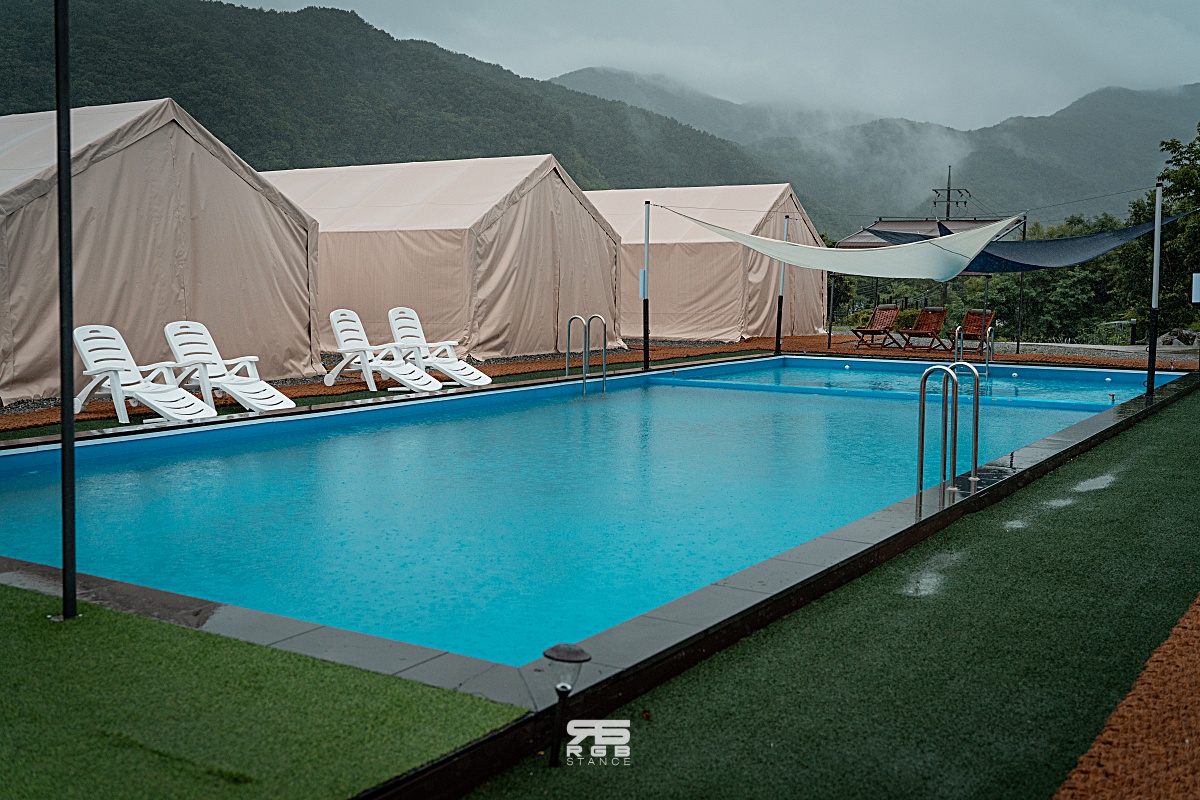 그리고, 망고땡글램핑에서 ‘수영장’ 을 빼놓을 수 없다. 어린 아이들도 놀 수 있는 앝은 깊이의 풀과 어른들이 놀 수 있는 풀이 구분되어 있다. 여기 수영장은 17 X 6 m 의 사이즈이며, 지하 150m 의 음용 암반수를 사용해 깨끗하게 수질관리를 하고 있다.